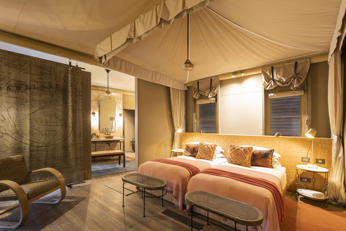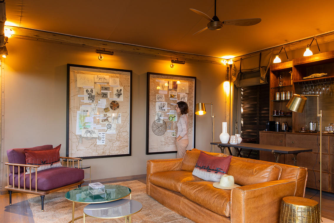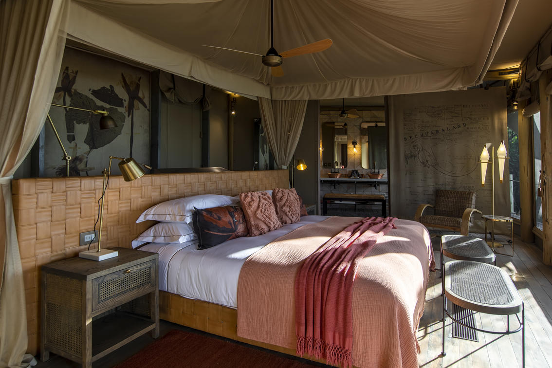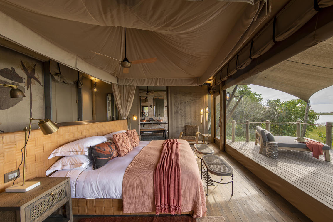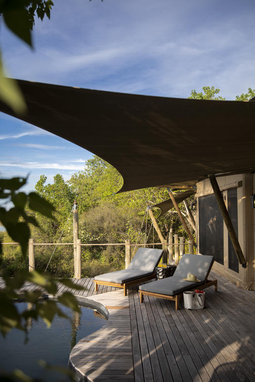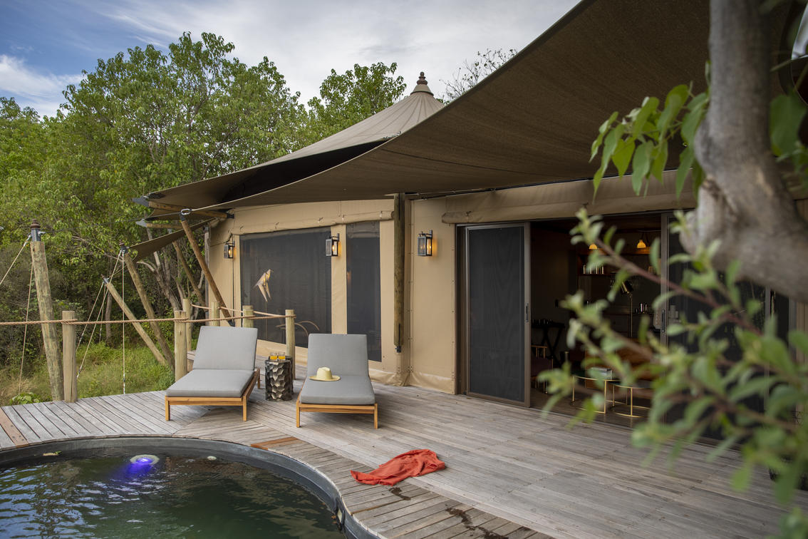 The luxurious guest suites are raised off the ground to take full advantage of the outstanding riverfront views. A sliding gauze door in the back of the tent improves airflow through the suite, while the en-suite facilities include a sliding fabric wall that can be closed to ensure absolute privacy. An extended deck, with private plunge pool, and awnings create a relaxing shaded space to soak in the views and watch the wildlife moving past.