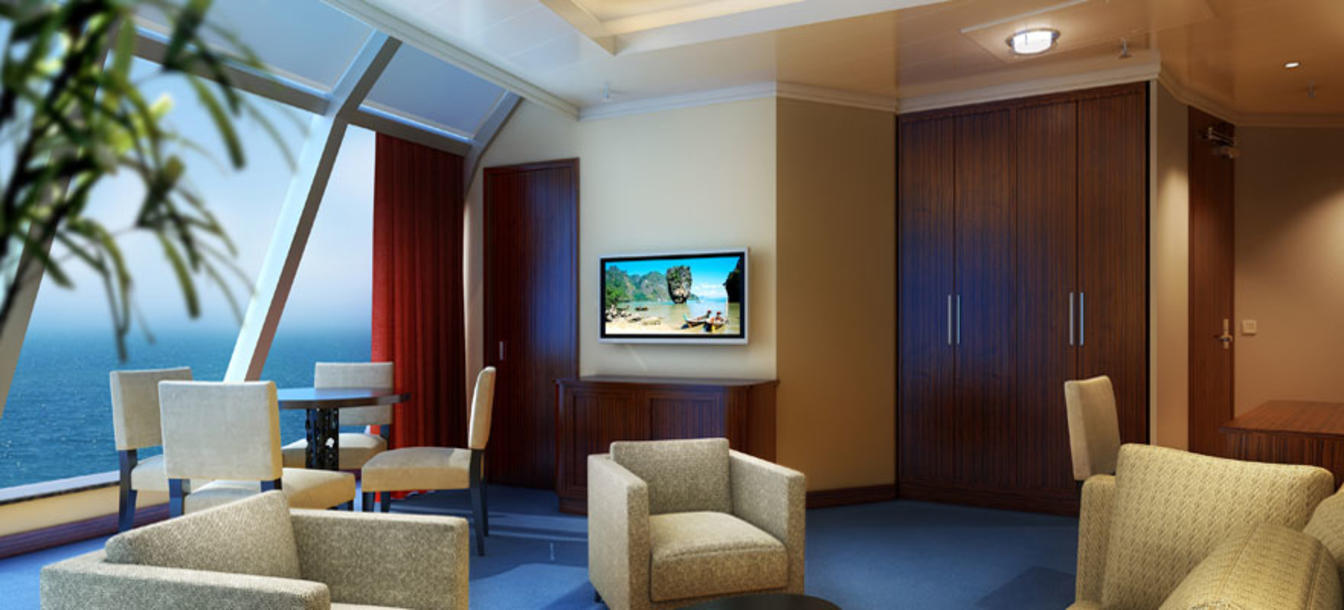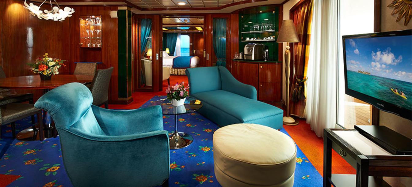These Penthouses sleep up to three guests and include a bedroom with queen-size bed and luxury bathroom with a shower in addition to the living area and dining area. Because these are aft-facing, they offer an amazing view from the large balcony. A butler and concierge service is included.