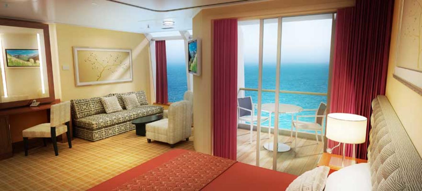With room for up to three guests, these staterooms have two lower beds that convert into a queen-size bed and a pull out sofa to accommodate one more. Also included are a sitting area, floor-to-ceiling glass doors, and a private balcony with an amazing view.