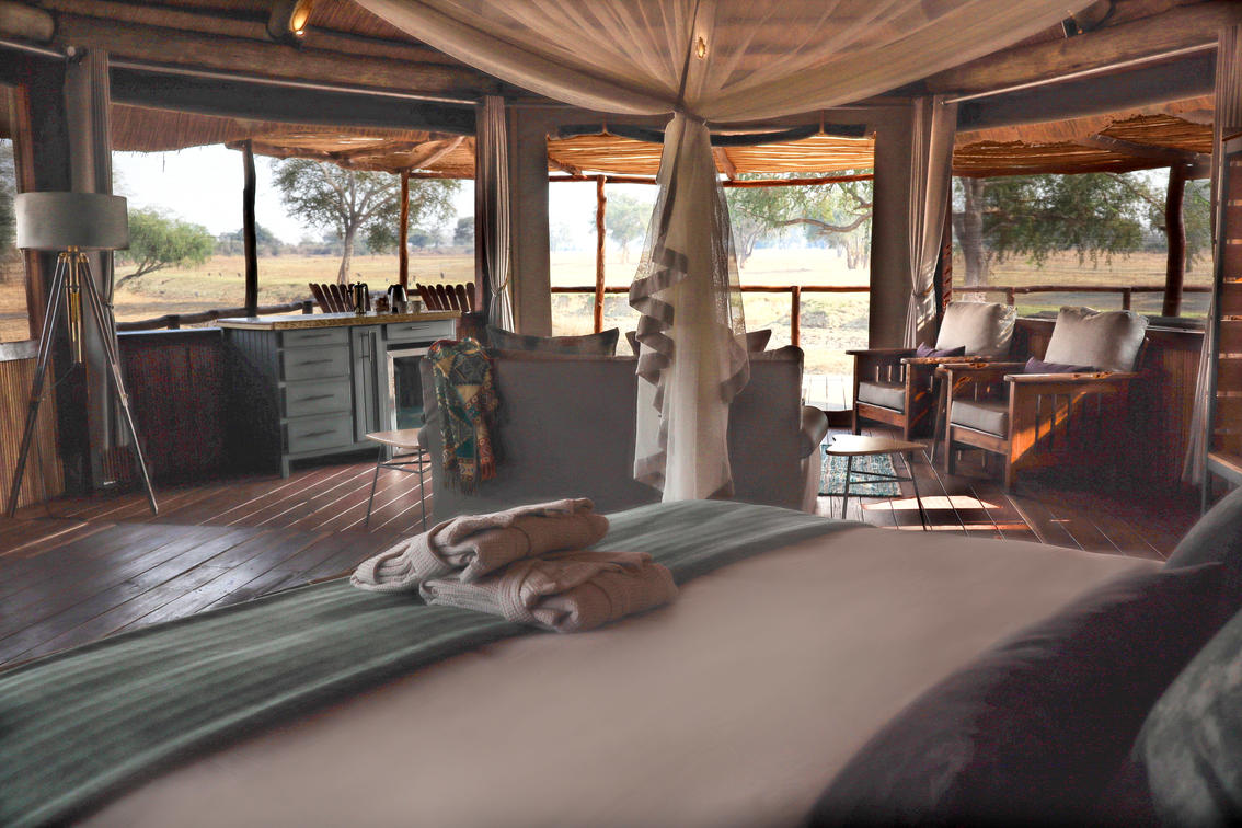 The honeymoon deluxe suite. It has one king-size bed and a large wrap-around deck with 180 degree views of the plain. It is the furthest suite from the main area of the camp and its seclusion makes it perfect for honeymoon couples. Our honeymoon suite in 2021 will become our most expensive suite as we added a beautiful "galaxy" sleep-out deck. This rate will also include a 1-night special picnic dinner with champagne at the suite.