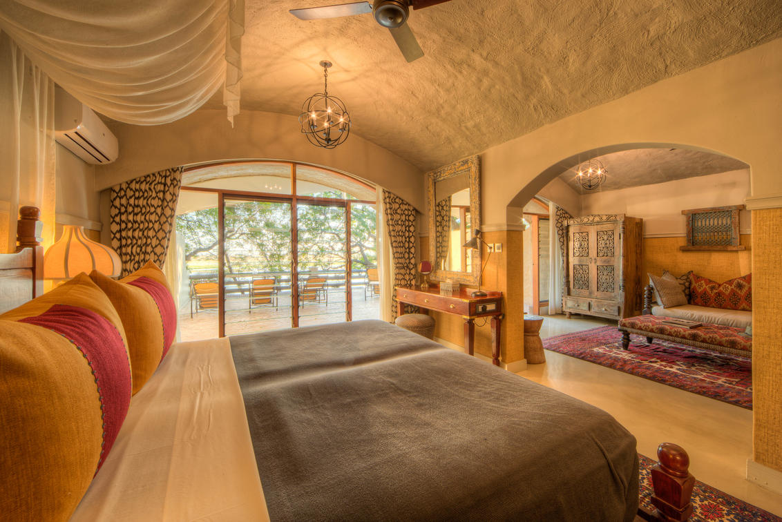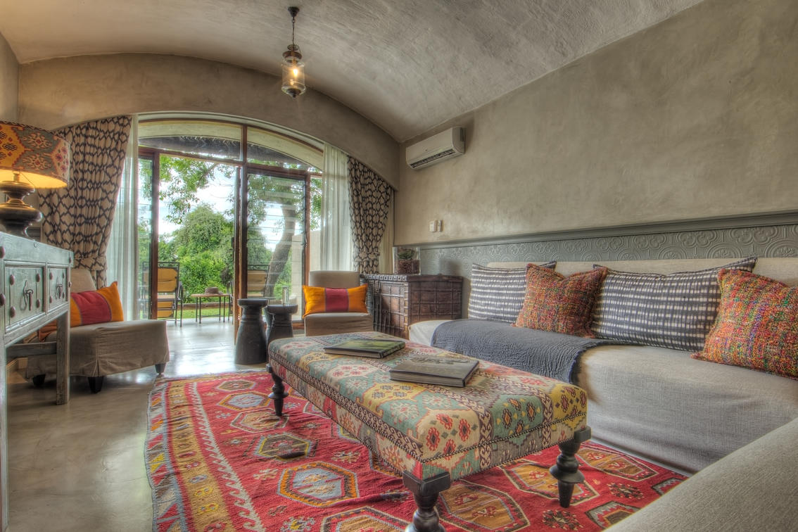 Inside is an open-plan lounge with comfortable loungers, a master bedroom with double bed and a second bedroom with twin beds, all opening onto the terrace. The shared bathroom is spacious and includes a separate bath, shower and twin washbasins. The room has been luxuriously appointed with air-conditioning, overhead fans and all the amenities you’d expect to enjoy on a luxury safari.