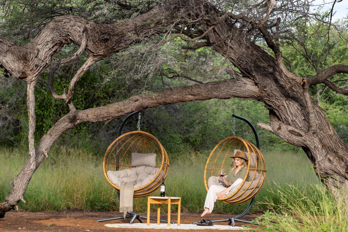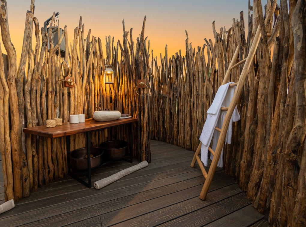 The private ensuite outdoor bathroom features a bucket shower with hot water available on request, a toilet and a basin with running water.