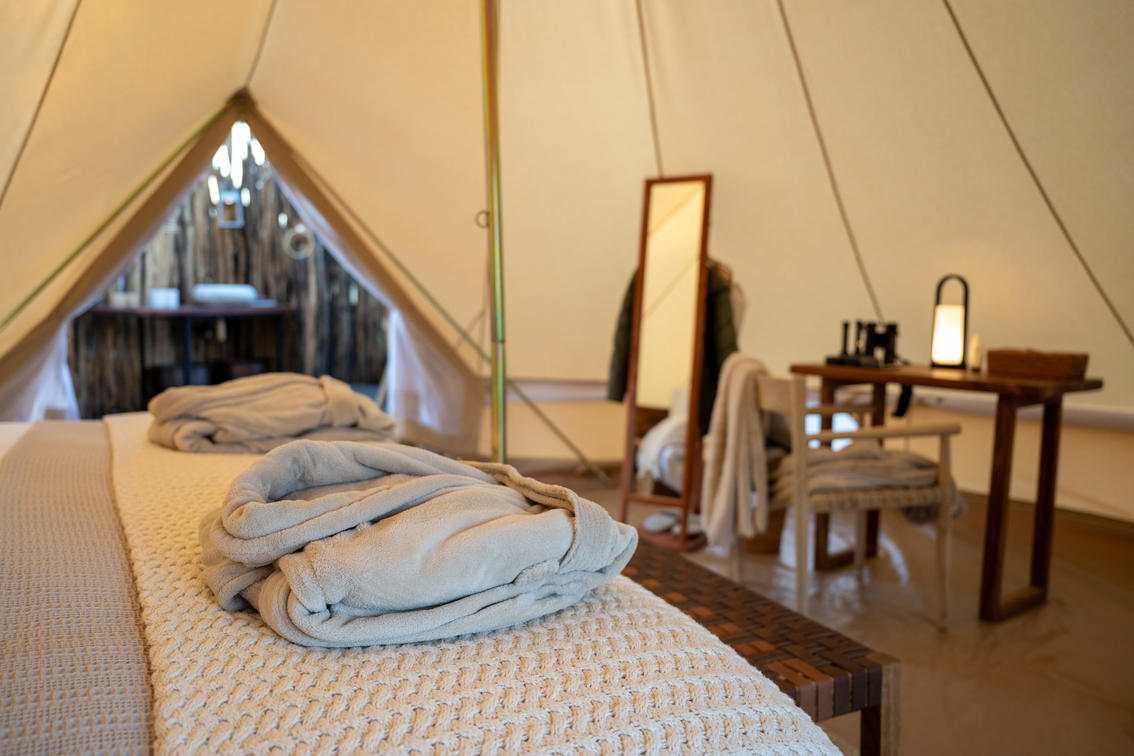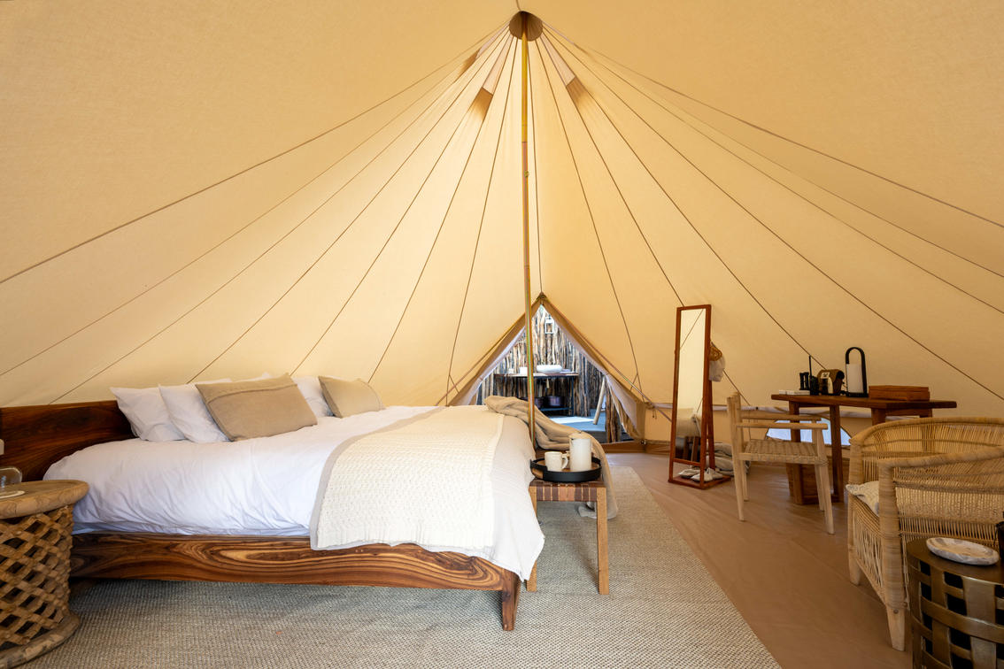 The en-suite glamping Bell Tents all feature extra-length beds, which can be twins or king beds and sumptuous bedding.