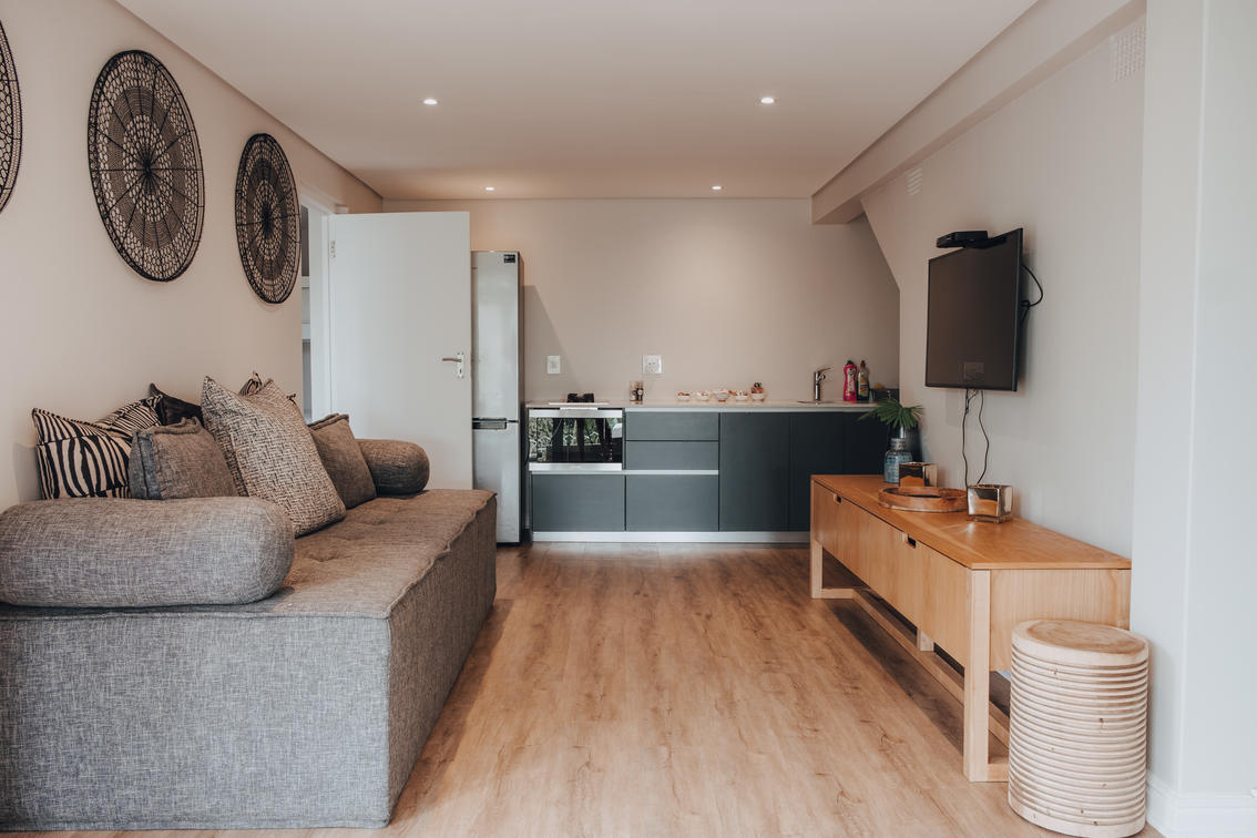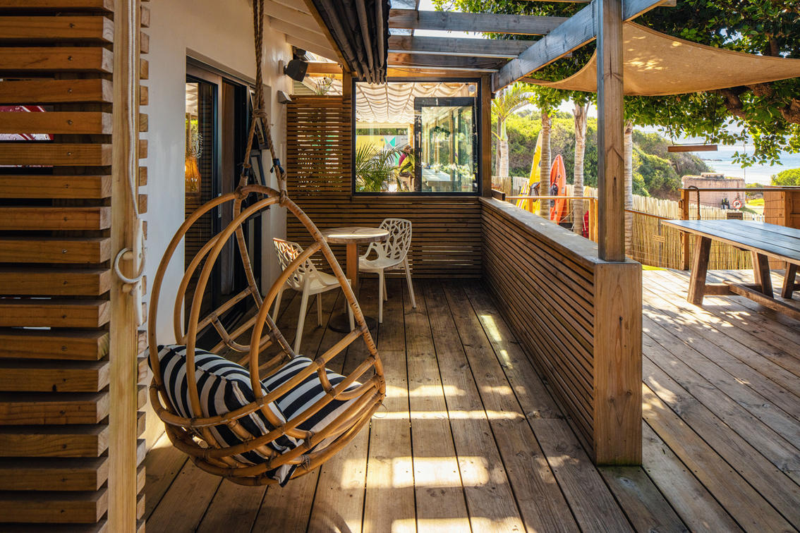 It is sea-facing and sleeps 2 adults and 4 children. It has a king size bed with an en-suite with shower and bath and 4 single pods with an additional bathroom with shower only. It has an open plan lounge, kitchenette and a private outside deck with a braai.