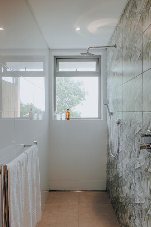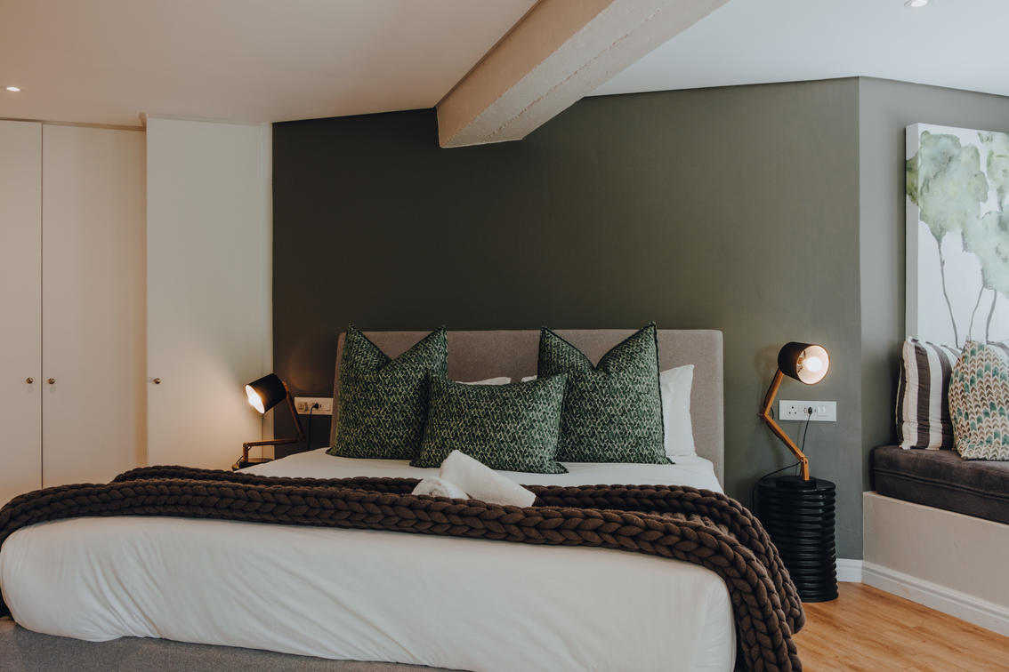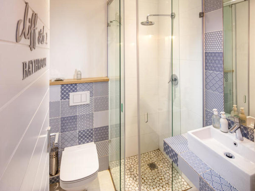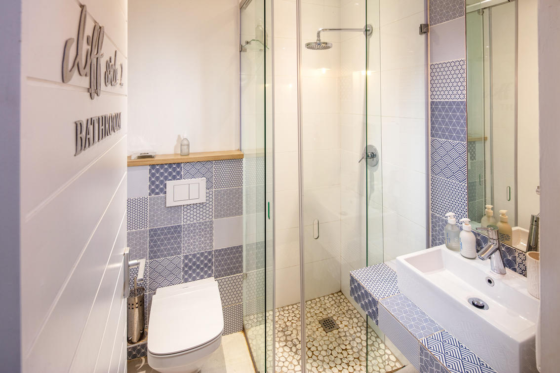 This bedroom is sea-facing and has a queen bed and en-suite bathroom with shower only. It also has sliding doors opening up to a cosy terrace.