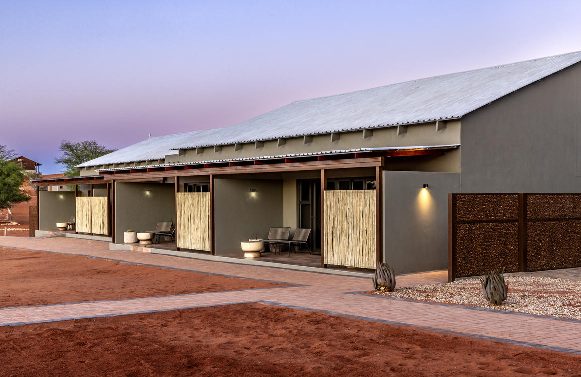 Constructed with thick walls, 6 of these were built from plastered straw bales, and all the savanna chalets stand well apart from each other in the 'street' between the dunes with scenic views. Each with en-suite shower facilities, air-conditioning, coffee/tea station, mini bar & sleeper couch