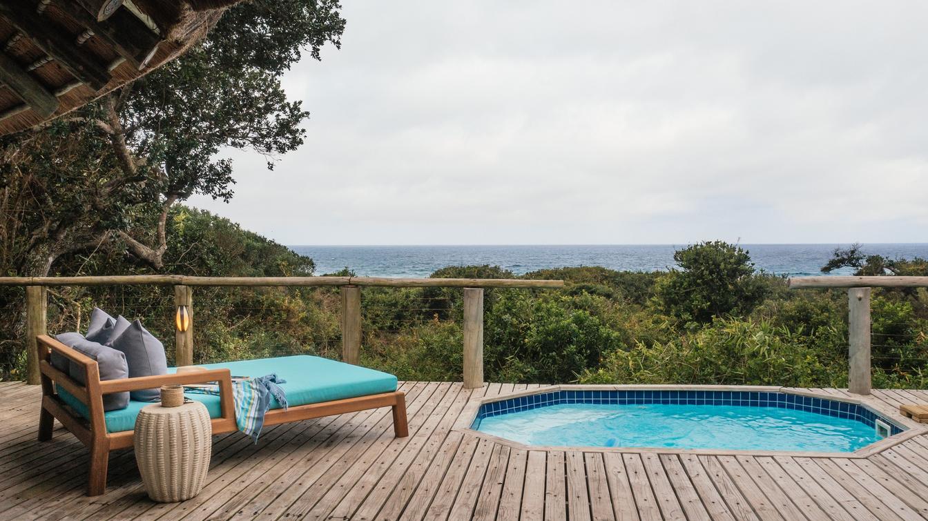 Double or Twin Ocean View Room , double vanity, bath, indoor and outdoor shower, mini bar and tea and coffee making facilities, including nespresso machine. Rooms are air-conditioned, overhead fans, mosquito nets, safes and hair dryers. This suite has a private plunge pool on a private deck.