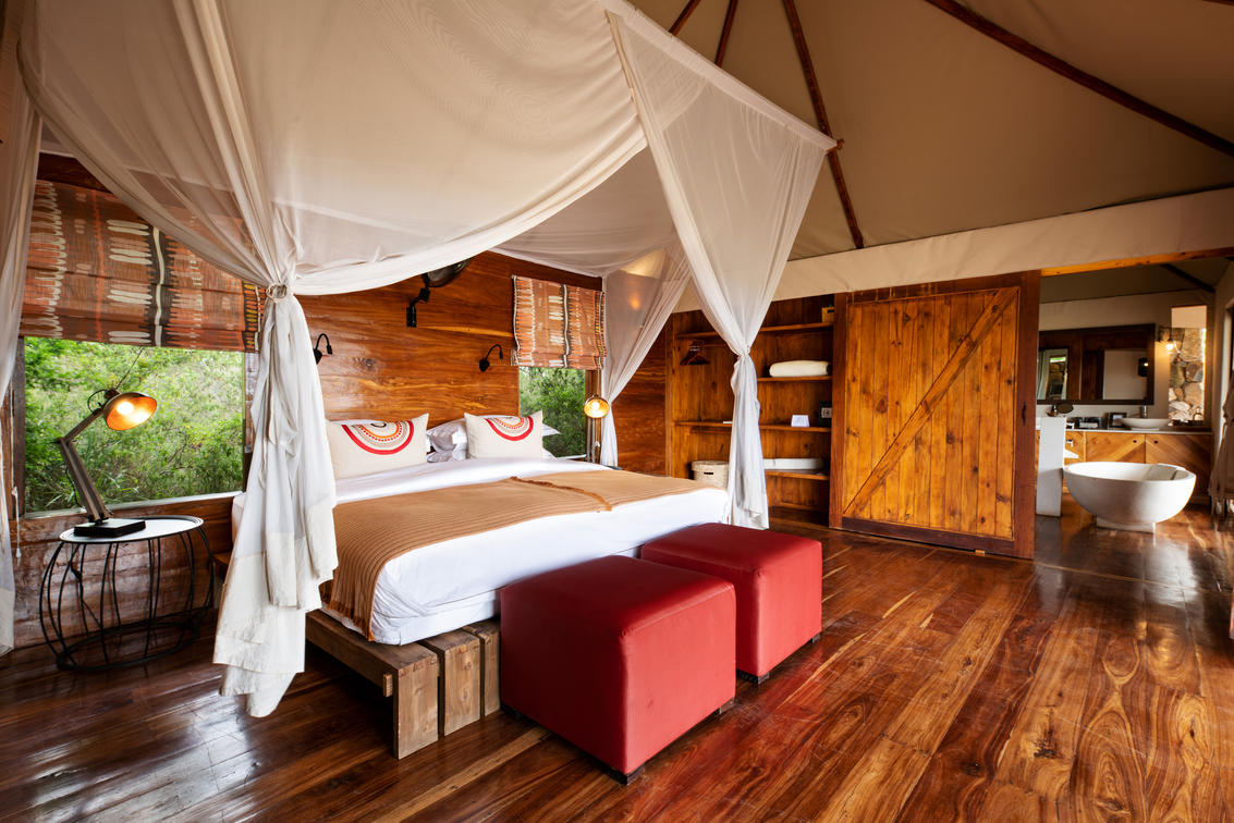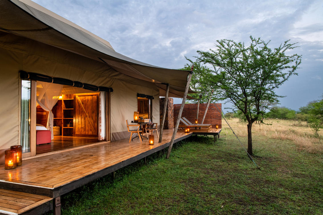 The remote and starkly beautiful landscape of the Northern Serengeti inspired the design of Sayari's 15 tented suits, which are a subtle mirror of the iconic flat-topped volcanic Turner Hill to the north. Inside, the rich mahogany floors and delicate tones of sand, stone, and acacia reflect the hues and textures of the natural terrain. Each spacious suite has a king-sized bed (twin beds available) with fine linens and safari-chic decor to offset the wilderness just beyond the canvas walls. The en-suite bathrooms with walk-in shower and egg-shaped bathtub overlook the Northern Serengeti plains, as do the beautiful private verandas outside.