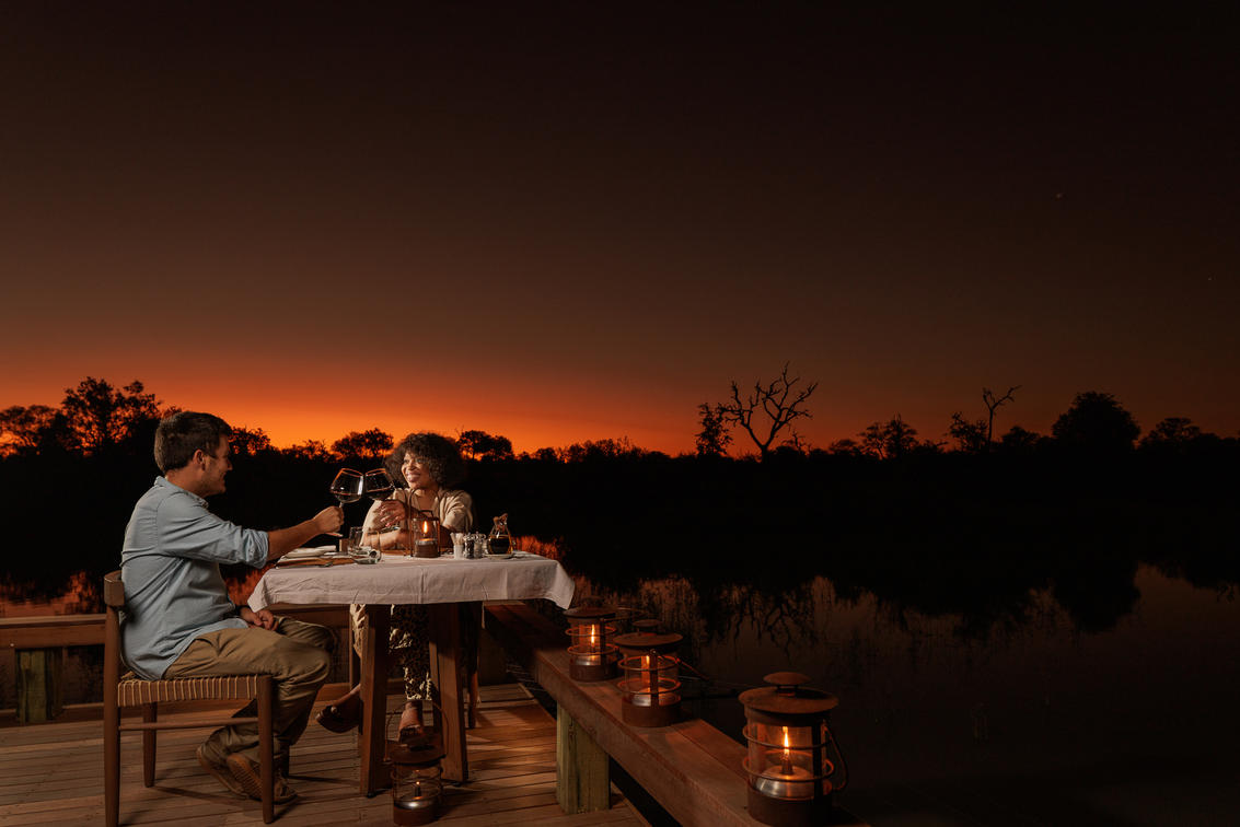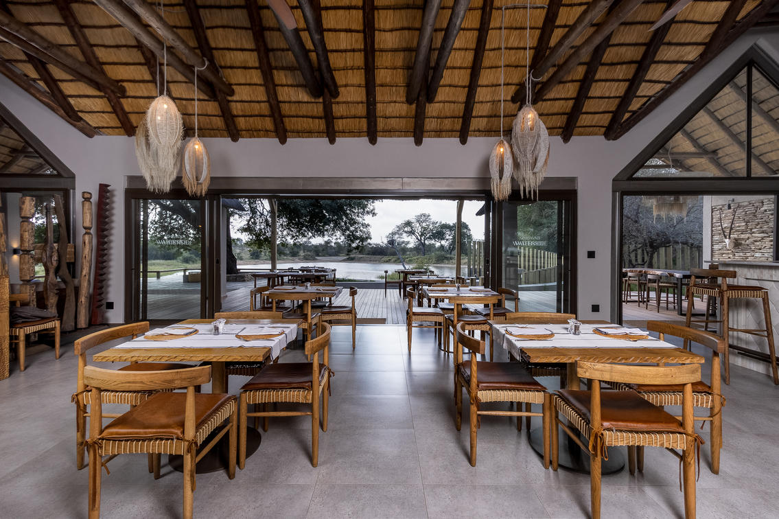 Simbavati Waterside offers a unique dining experience with both indoor and outdoor deck seating, a bush boma for starlit dinners, and a 'Beach-Boma' featuring a pizza oven and fire pit, set at eye level with the serene waters of the dam.
