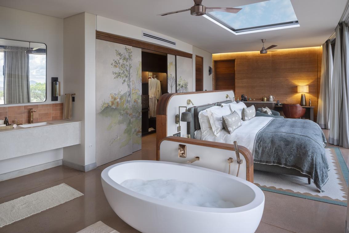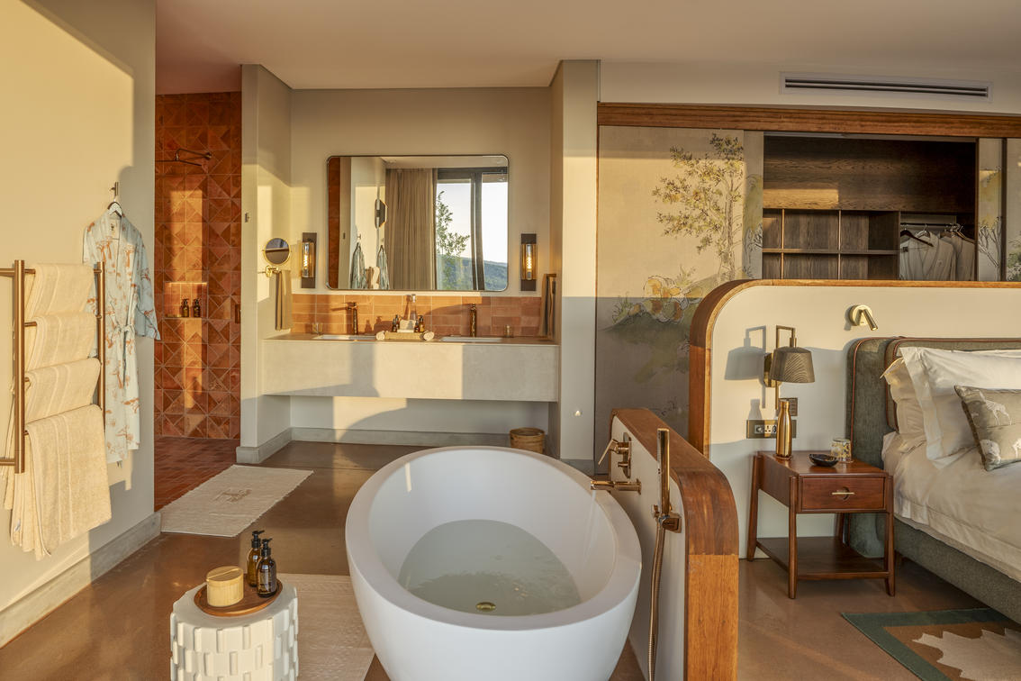 bath and outdoor shower, walk-in wardrobe, hidden television, aircon, fans, minibar, coffee