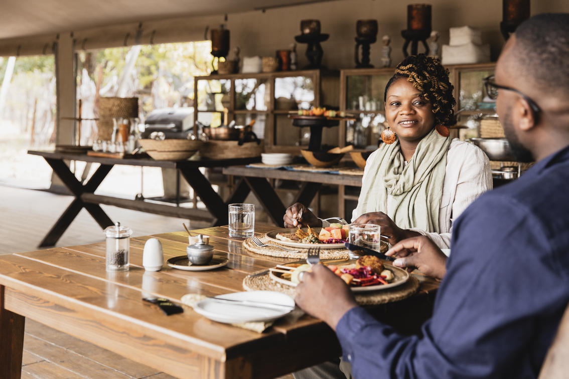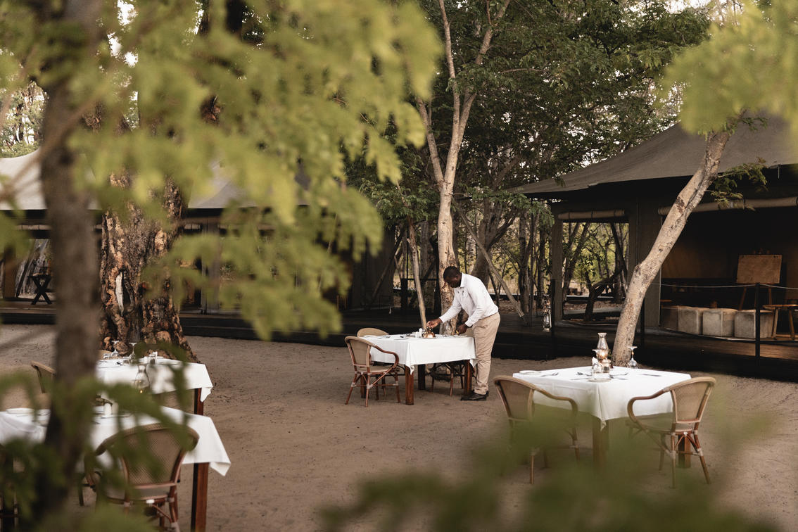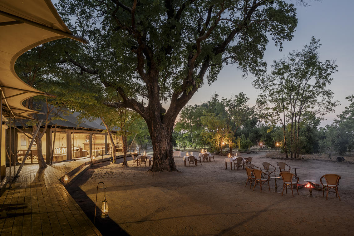 A towering false mopane tree in the centre of the camp shades a separate dining and lounge area