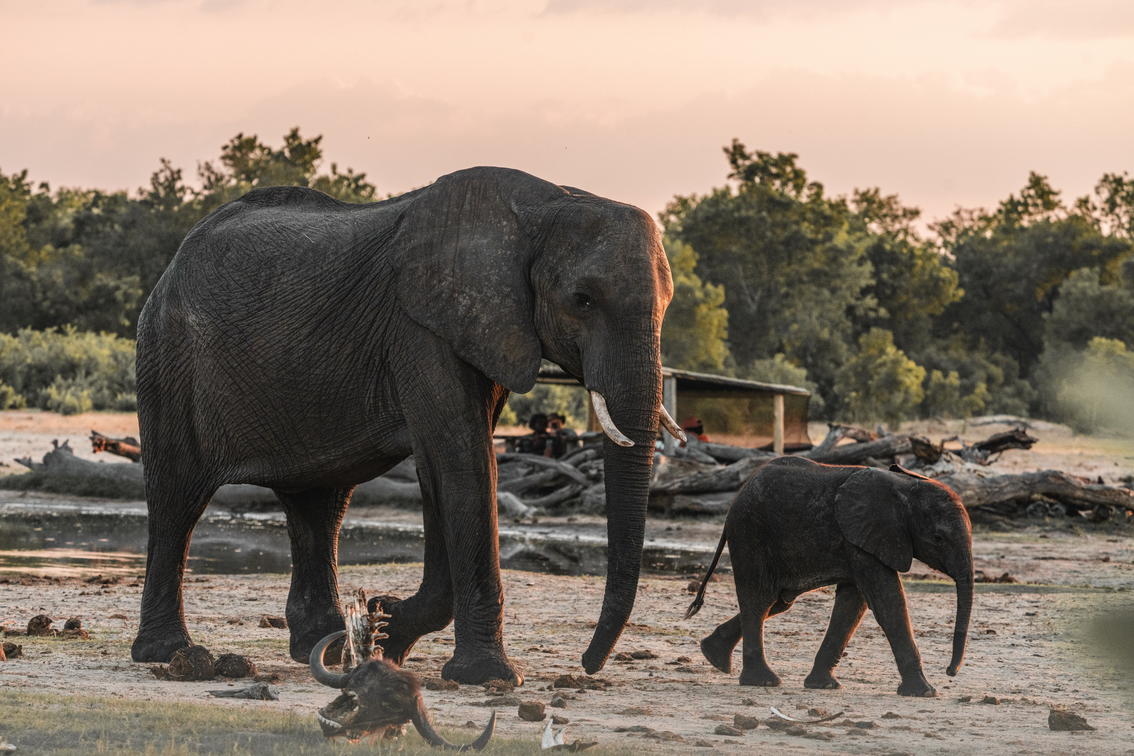 Elephant mother and calf as seen from the log pile hide
