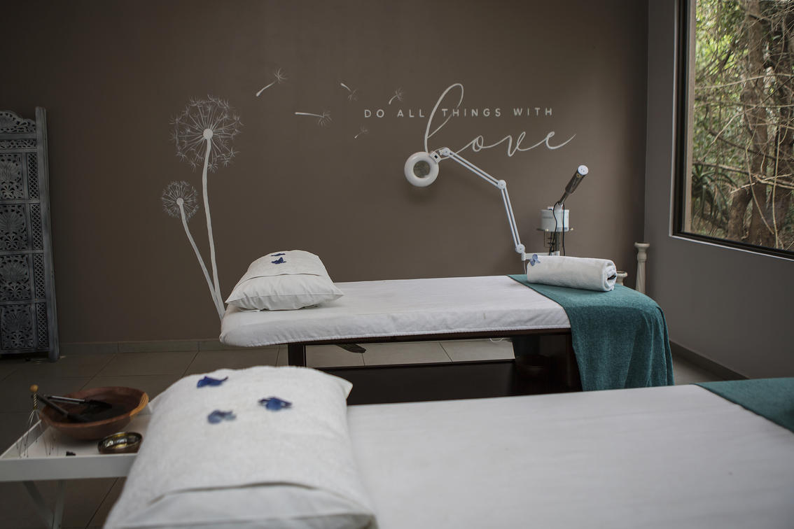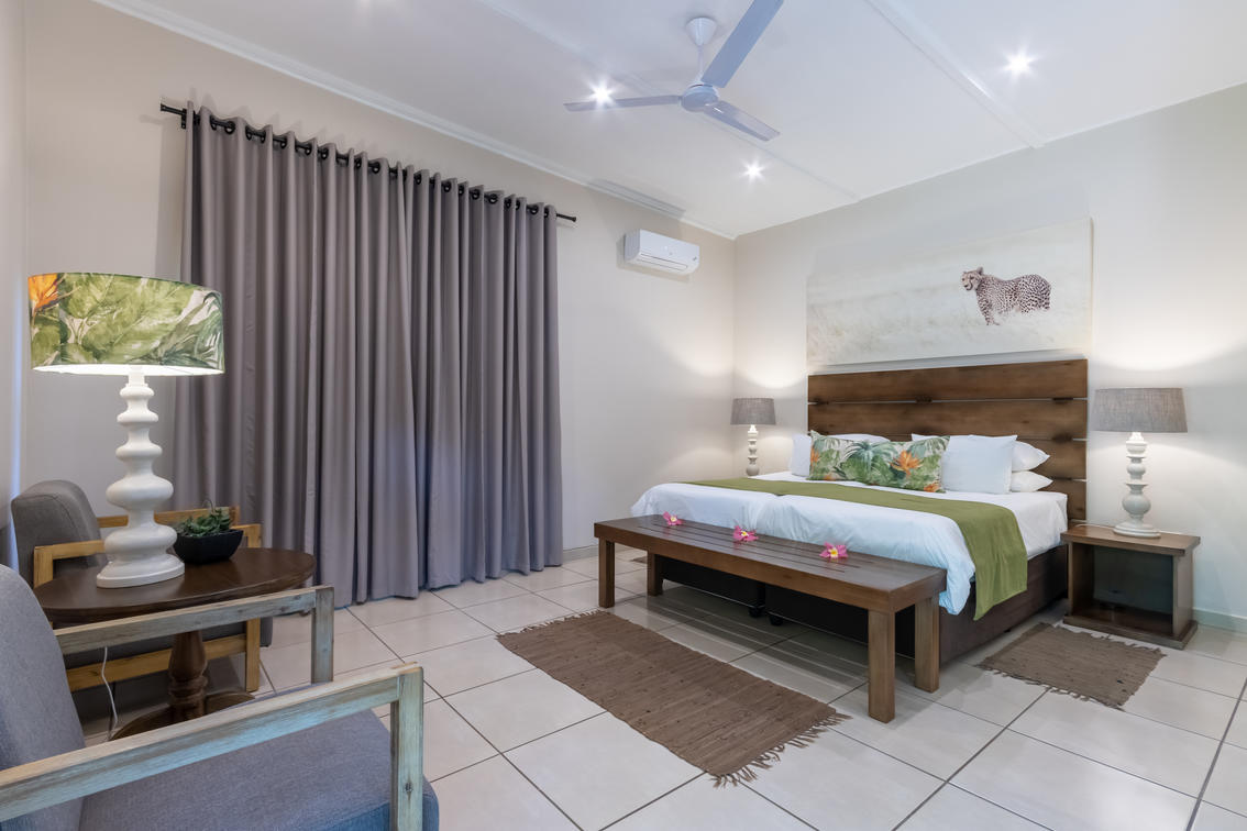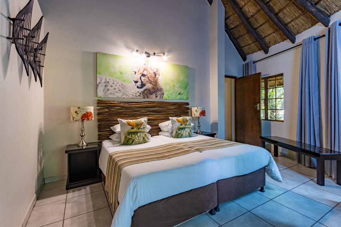 African-style, round, thatched-roof rondavels. Two bedrooms each with its own bathroom (with shower only). There is an adjoining door between the two bedrooms, making it ideal for families.