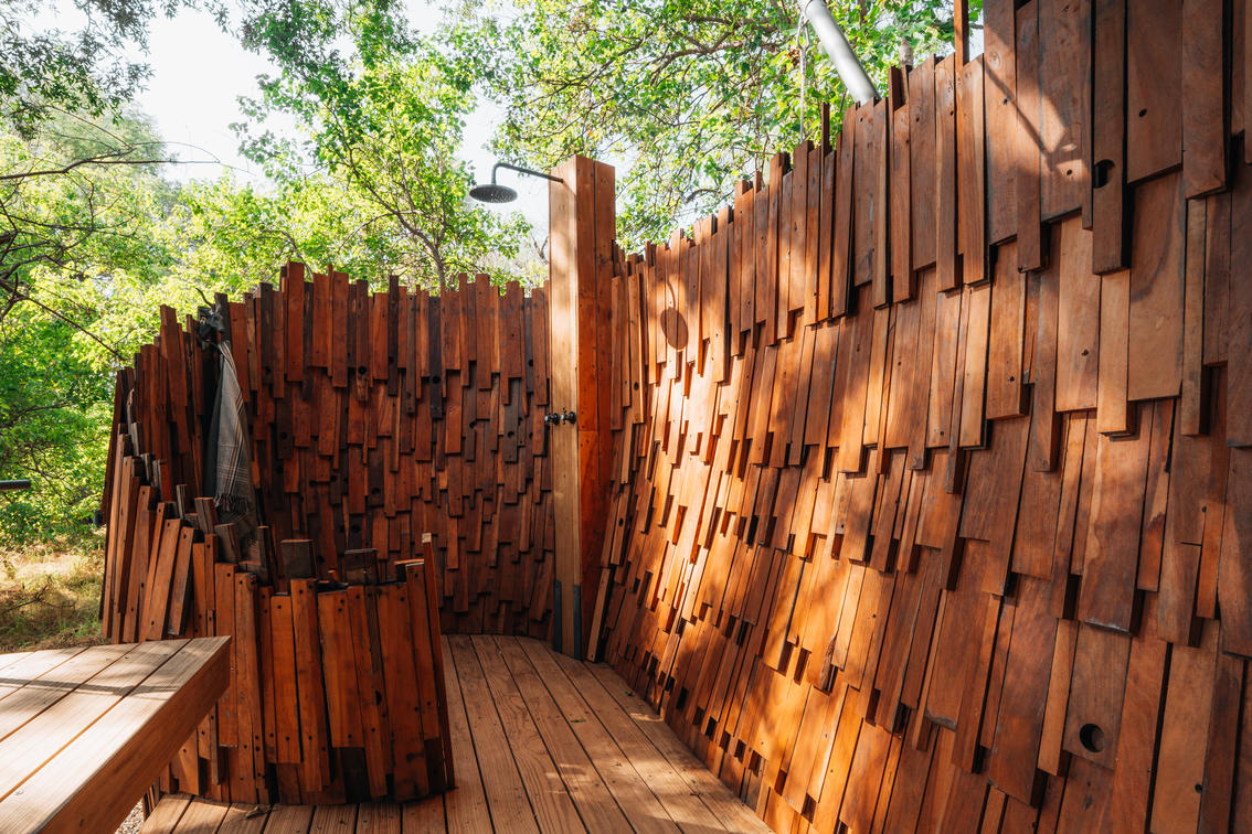 Step into the indulgent outdoor shower for a refreshing take on this daily ritual.