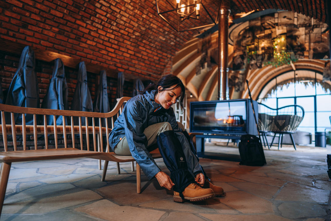 The designated mud-room where gaiters, gloves and rain gear are provided to guests preparing for their gorilla trek.