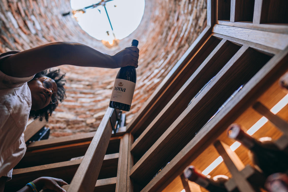 The climate-controlled wine tower is stocked with an impressive selection of fine wines.