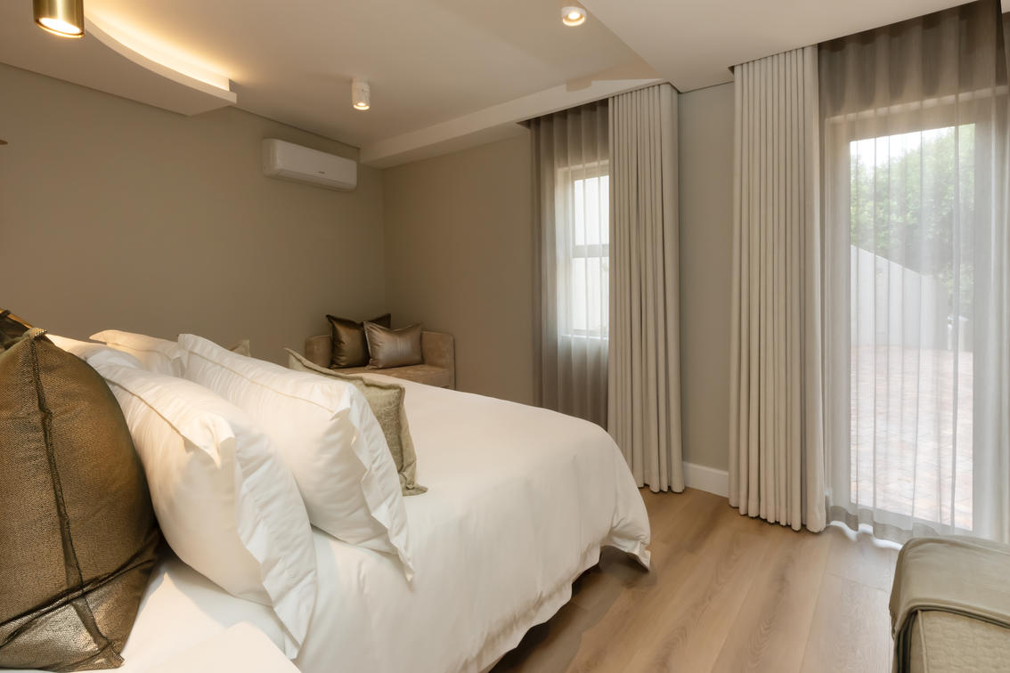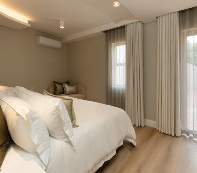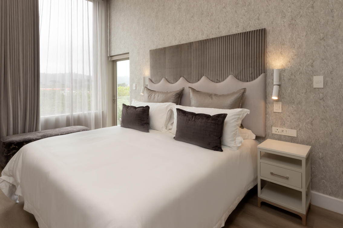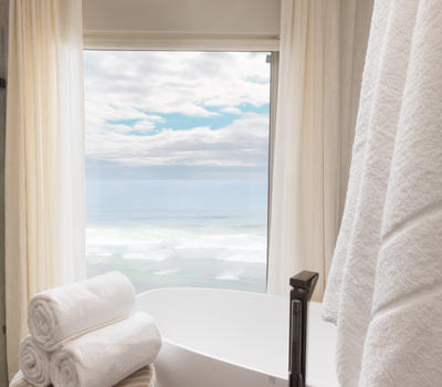 This magnificent suite offers a spacious bedroom and sitting area complete with living room, expansive open plan marble bathroom with free standing bath tub, dual showers, double basins, and private toilet. An expansive double private balcony has seamless 180 degrees views both east and west of the Indian Ocean coastline and Wilderness Beach. On a clear day, Gericke’s point to the east and Mosselbay to the west can be spotted.