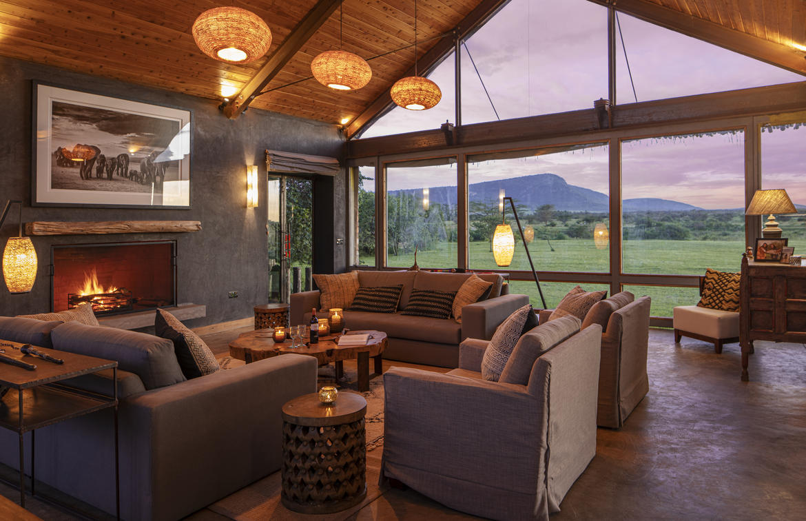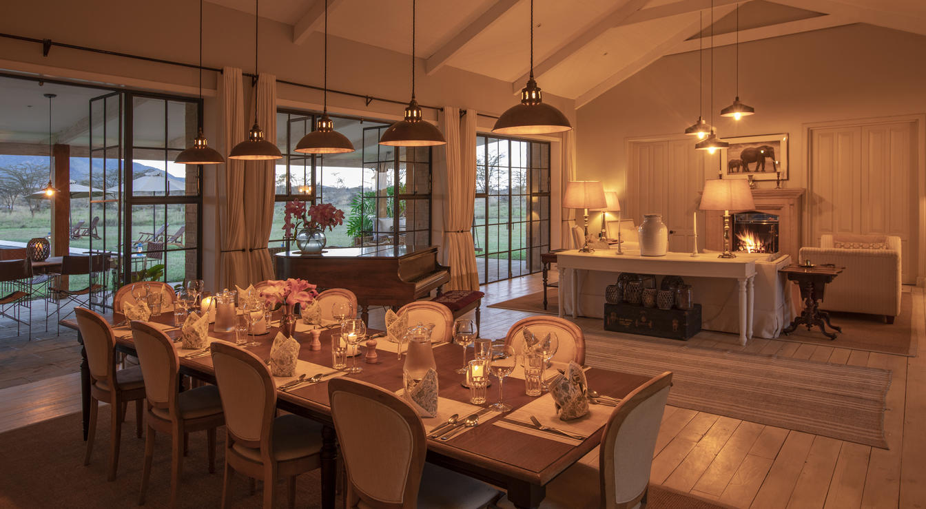 Private dining at the Amani House, with a grand piano and a roaring fire...