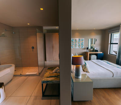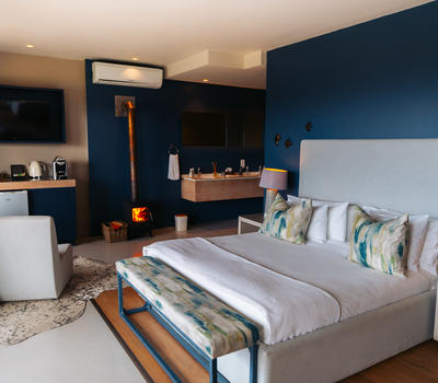 Our Presidential Suite boasts a King Bed and luxurious en-suite bathroom with a shower, deep soaking bathtub, a heated towel rack and underfloor heating. There is a cozy sitting area with a fireplace and a private terrace that opens to a breathtaking view of the ocean