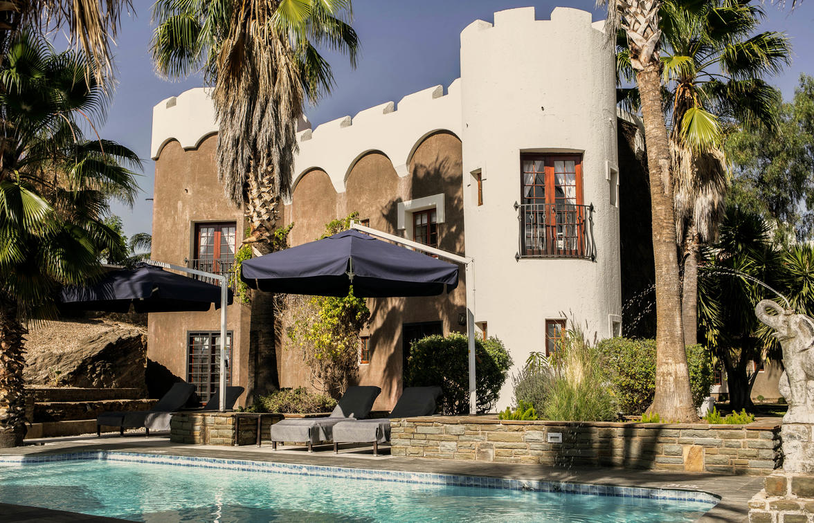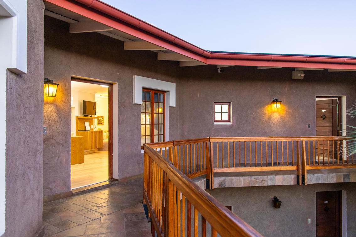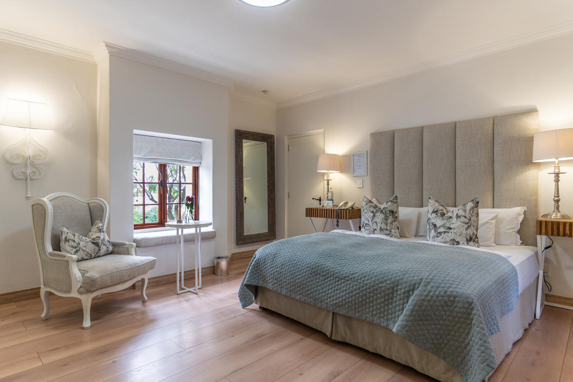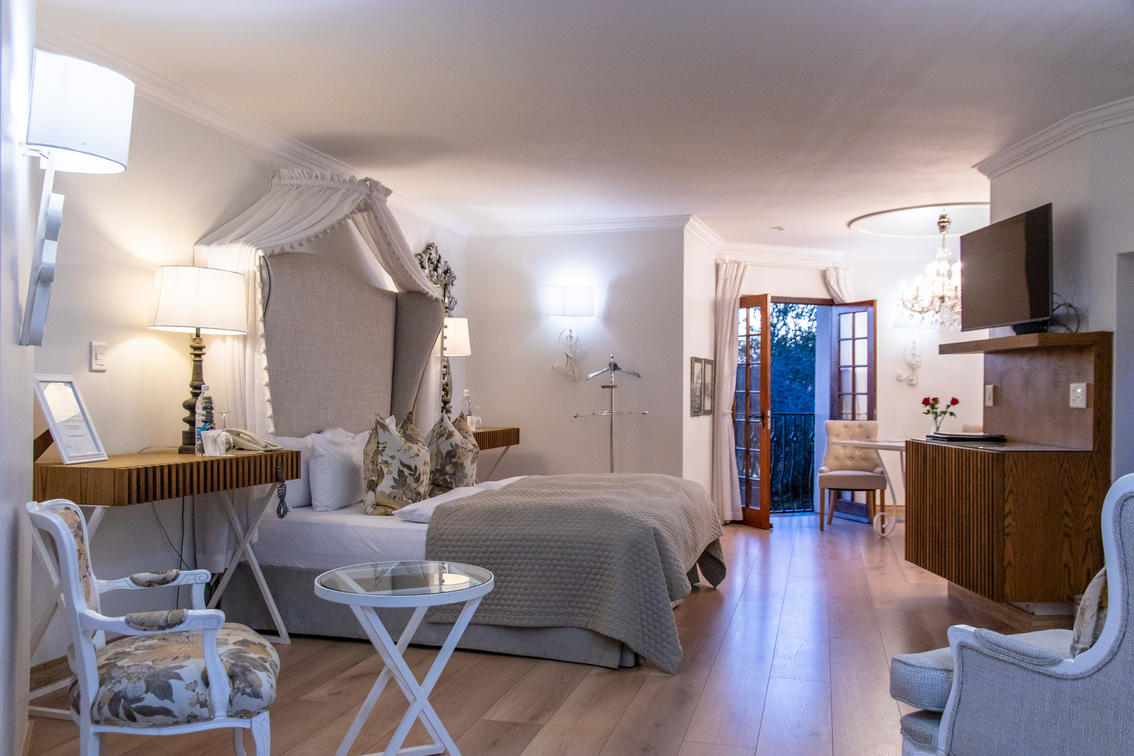 Large windows or French doors offer charming views—some overlooking the city of Windhoek, others the tranquil hotel gardens or surrounding hills.