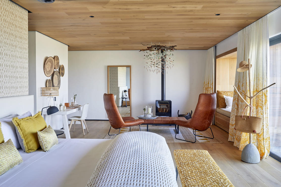 View of the bed and entrance to the bathroom of the Honeymoon Suite at Morukuru Beach Lodge