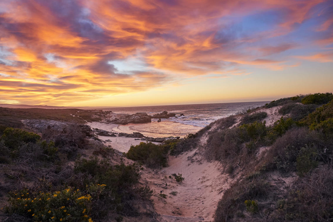 Colorful sunrise at Morukuru Beach Lodge in De Hoop Nature Reserve