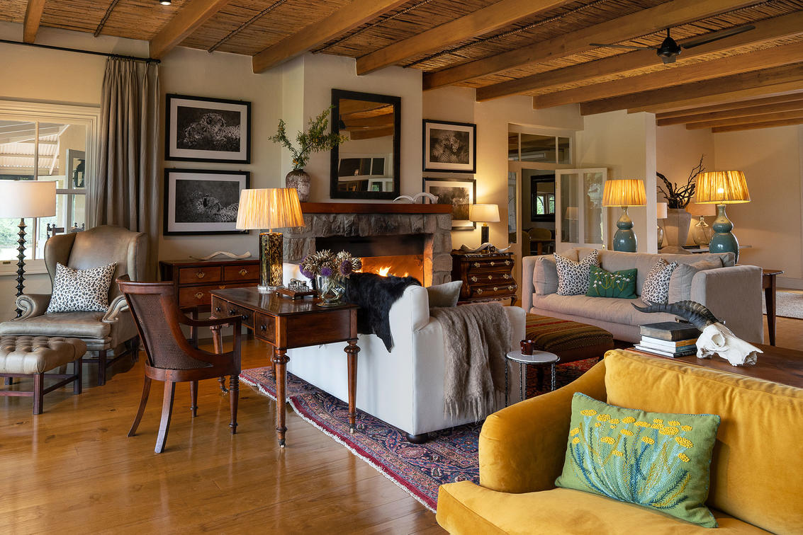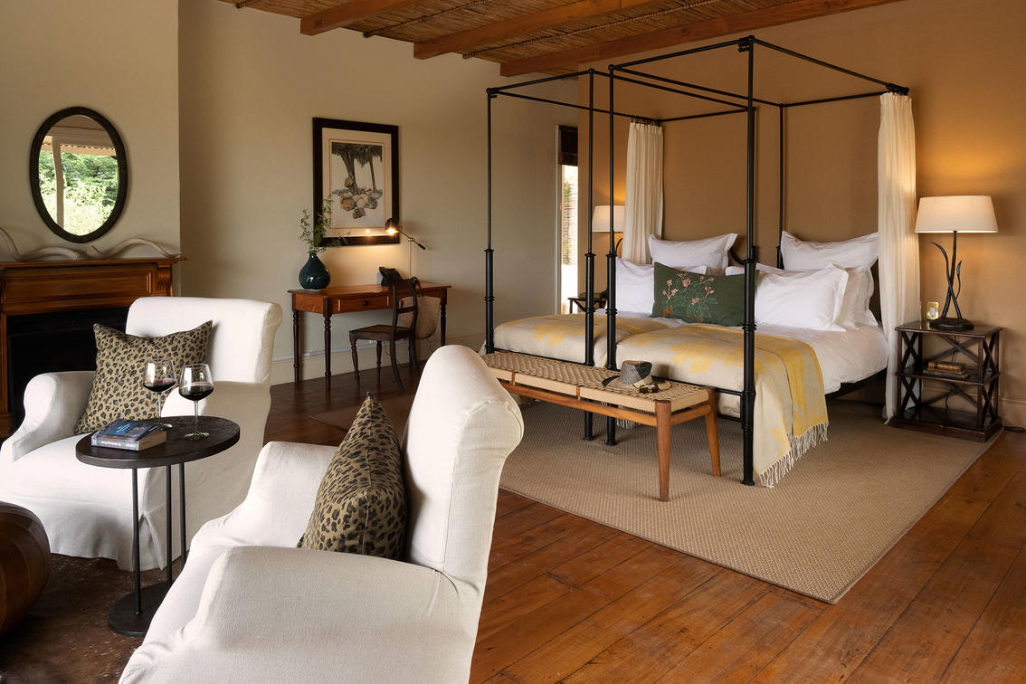 The Karoo Suite bedroom and seating area combine comfort and charm, featuring a plush bed, tasteful décor, and a cozy lounge space perfect for relaxation and taking in the serene surroundings.