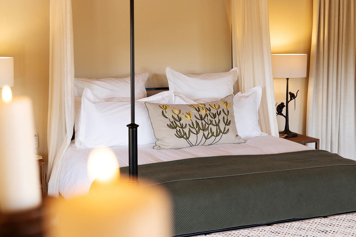 The bed in the Karoo Suite offers luxurious comfort with crisp linens, plush pillows, and elegant touches, creating a restful sanctuary for a peaceful night’s sleep.
