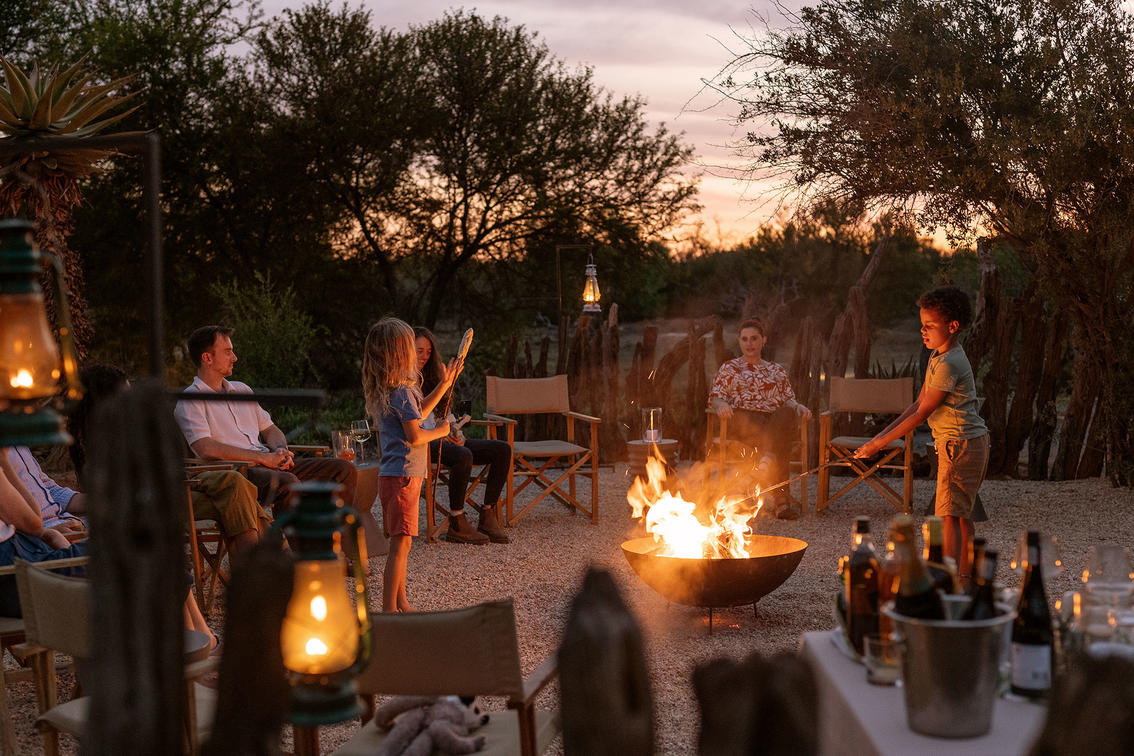 A traditional outdoor gathering space, the Boma features rustic seating around a central fire pit, creating a cozy atmosphere perfect for storytelling, dining, and enjoying evenings under the stars.