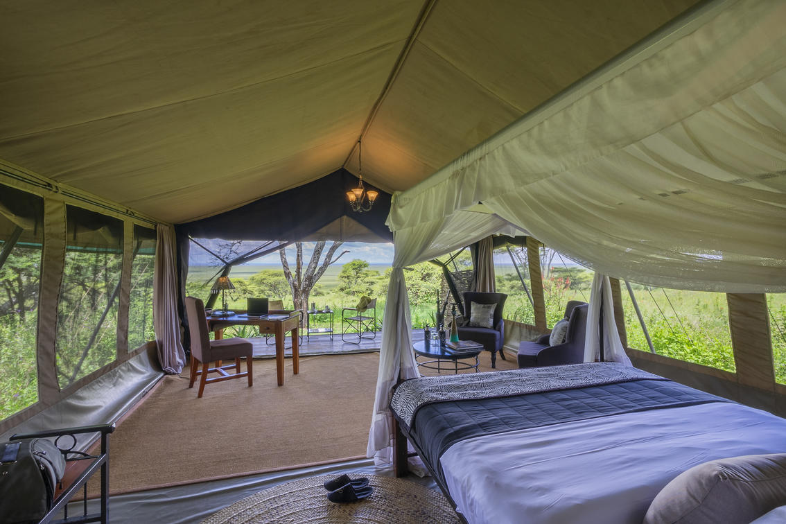 The tents at Serengeti Woodlands Camp, seated on the slopes of Naabi Hill, overlook the Ndutu Plains, providing luxury and comfort amidst breathtaking natural beauty.