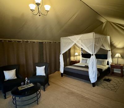 The family tents at Serengeti Woodlands Camp provide luxurious and spacious accommodations, featuring interconnected suites with private bathrooms. Elegantly decorated, each tent includes cozy seating areas and private decks for enjoying panoramic views of the Serengeti together.