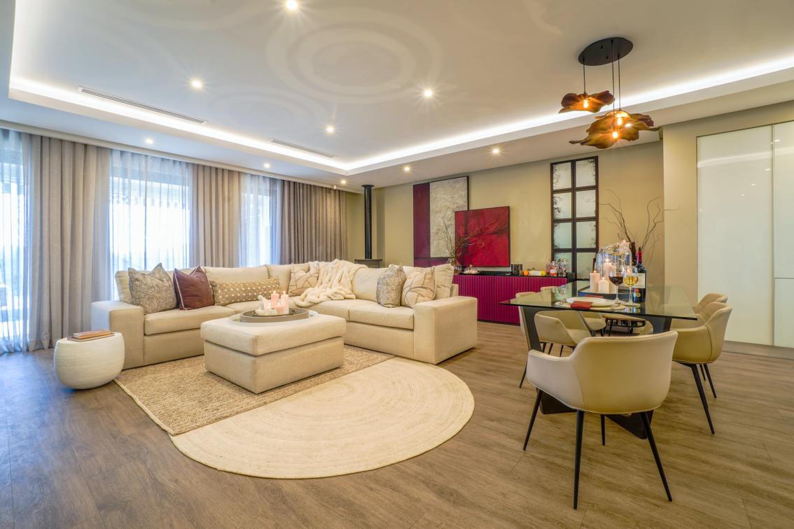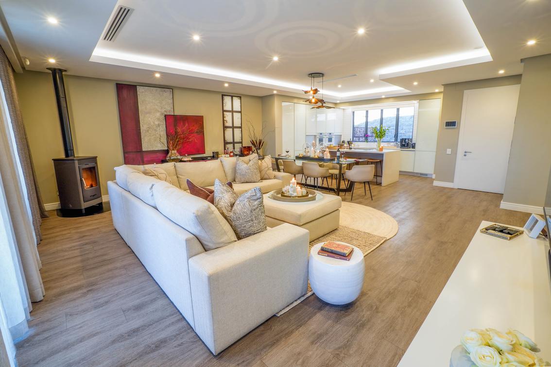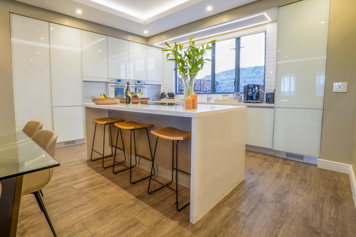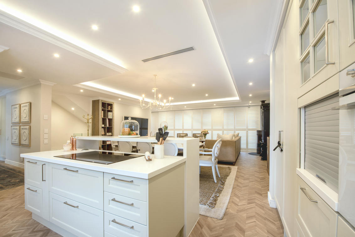 Open-plan entertainment area with American kitchen, dining room and TV lounge