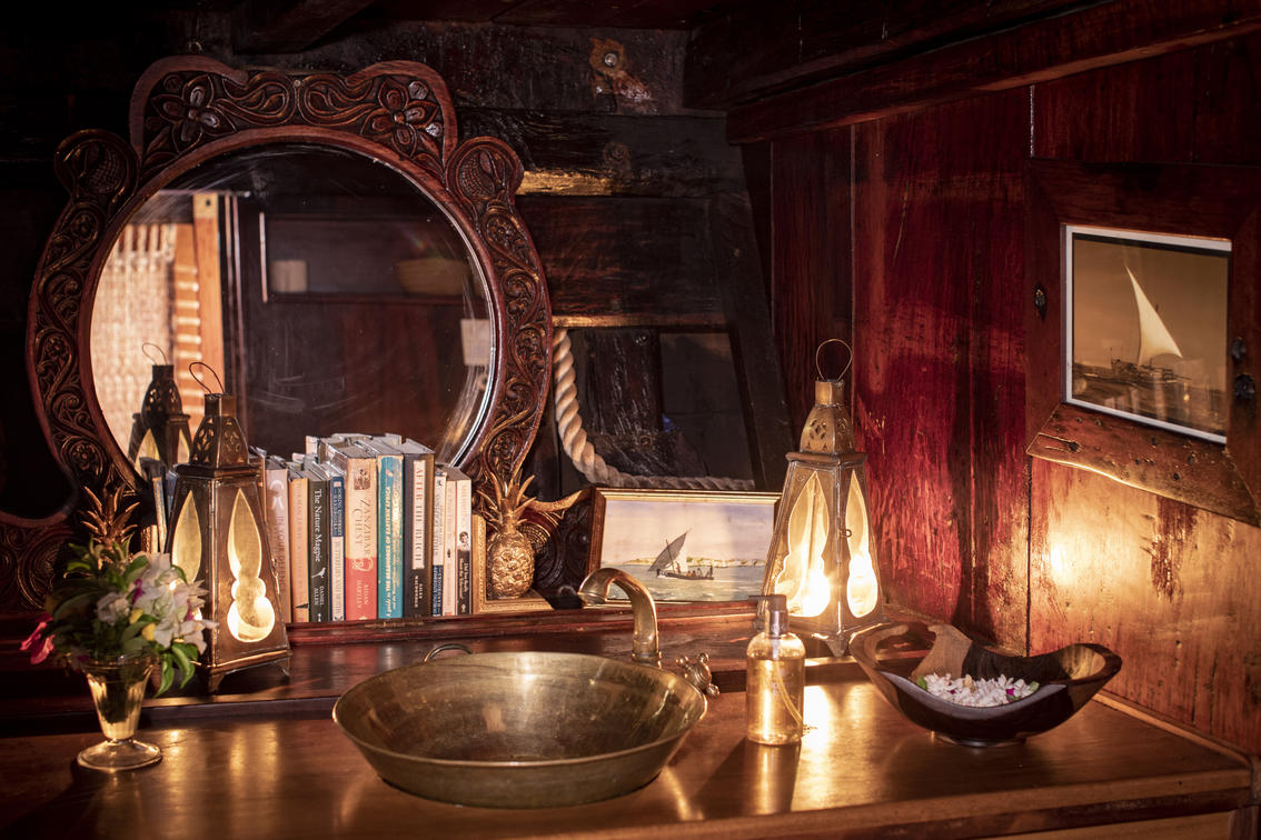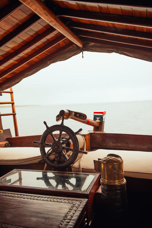 Beautiful antique wood and brass features on Tusitiri Dhow.