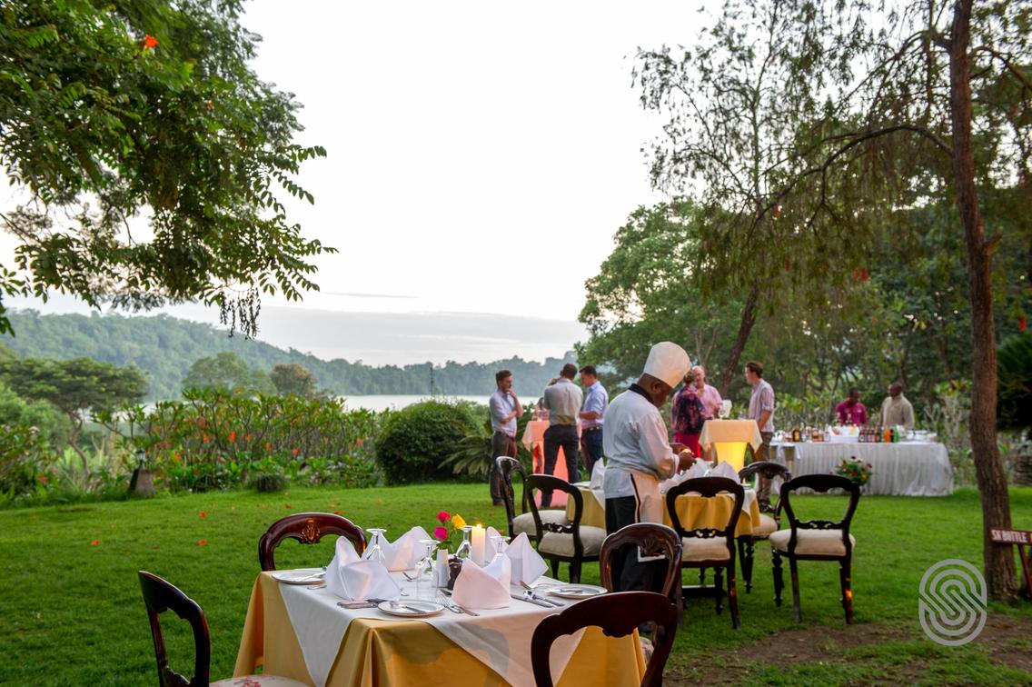 Arusha Serena Hotel's exterior is warm and inviting, with stone-built reception areas and cottage-style rooms nestled among landscaped lawns and colorful bougainvillea. The grounds feature extensive gardens and breathtaking views of Lake Duluti and the surrounding woodland slopes of Mount Meru.
