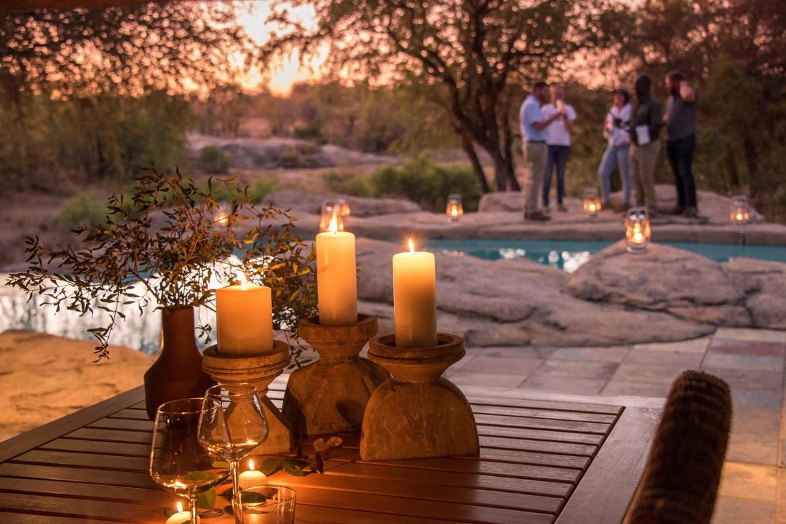 A custom designed waterfall pool feature overlooking the watering hole and wildlife