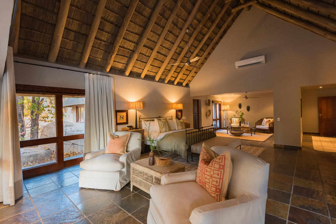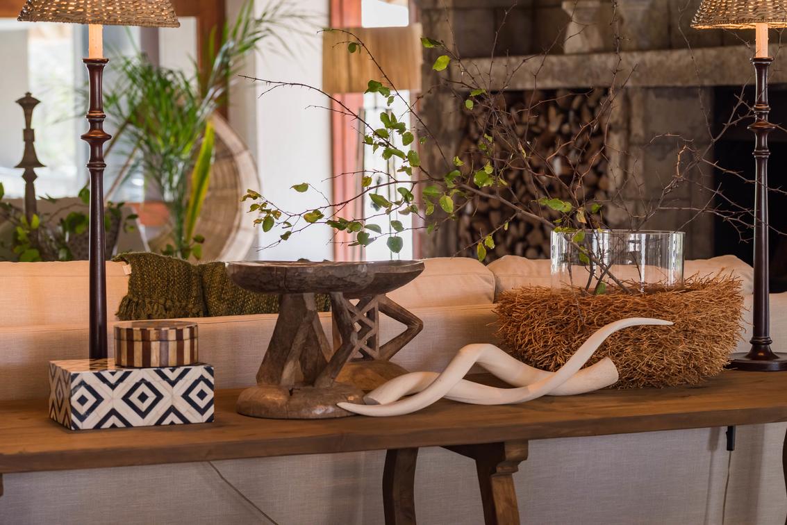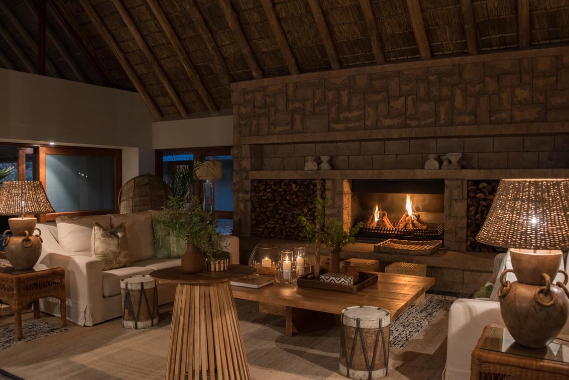 Expansive and luxurious main lodge area with a large fireplace in the heart of the villa