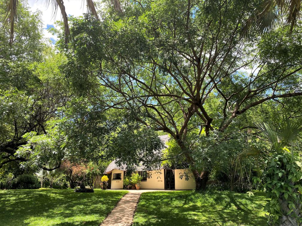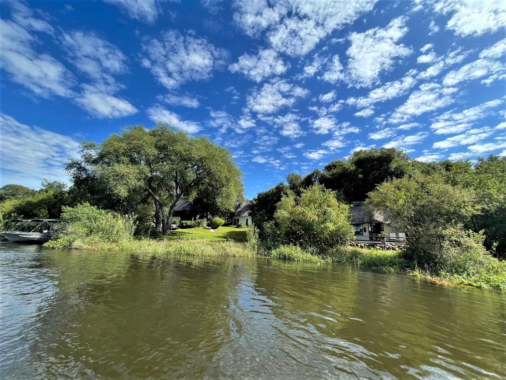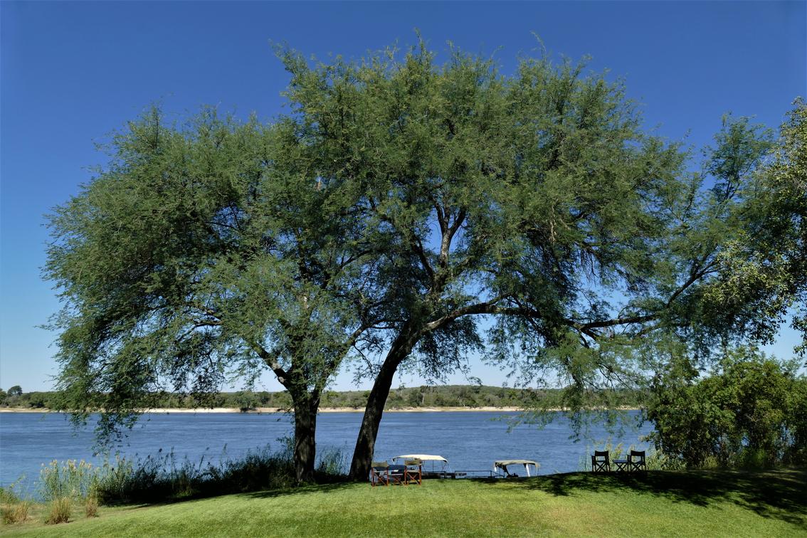 The lodge lawn overlooks the Zambezi and the national park beyond