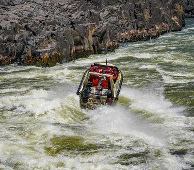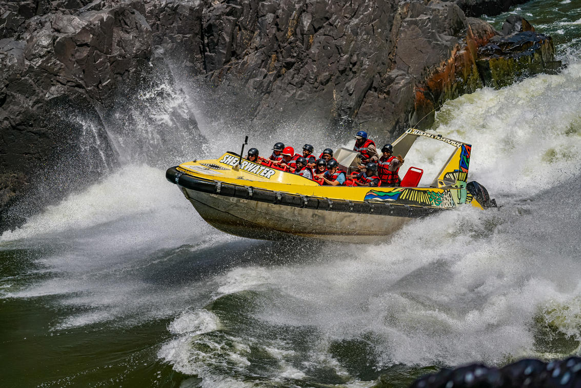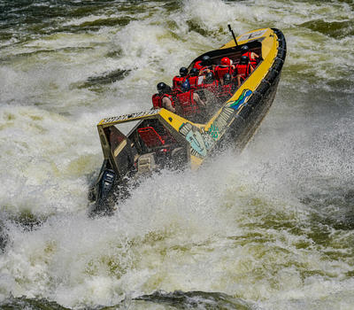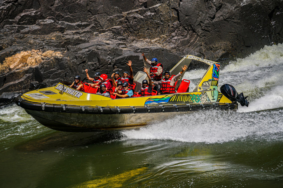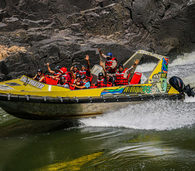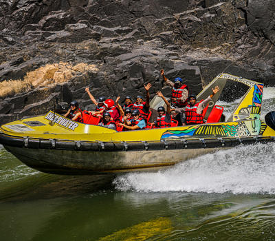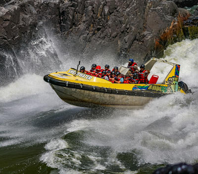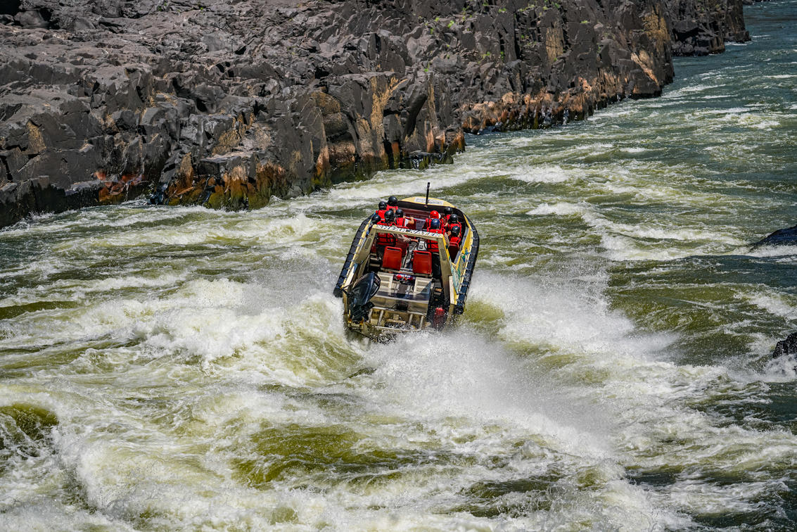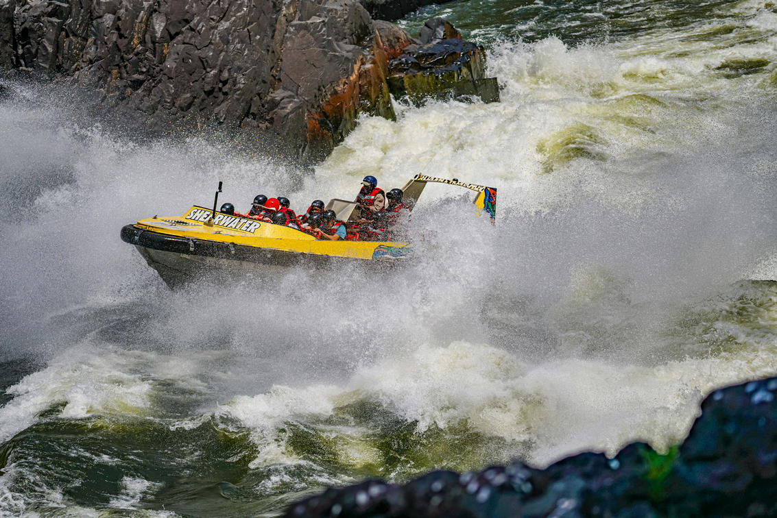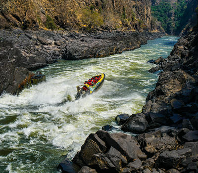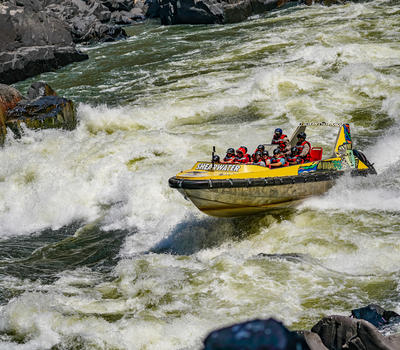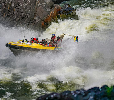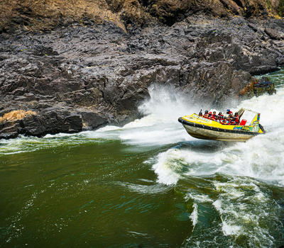 Experience the thrill of navigating the Zambezi River's rapids and encountering Victoria Falls up close on our Adventure Jetboat.