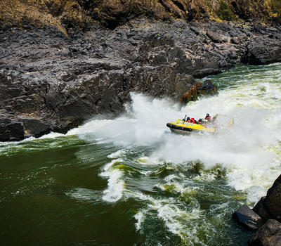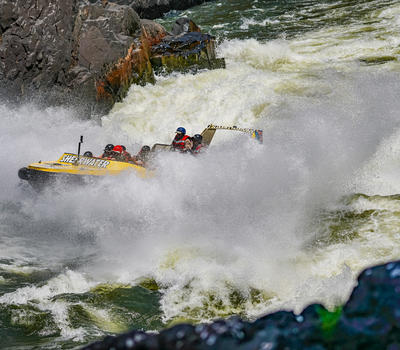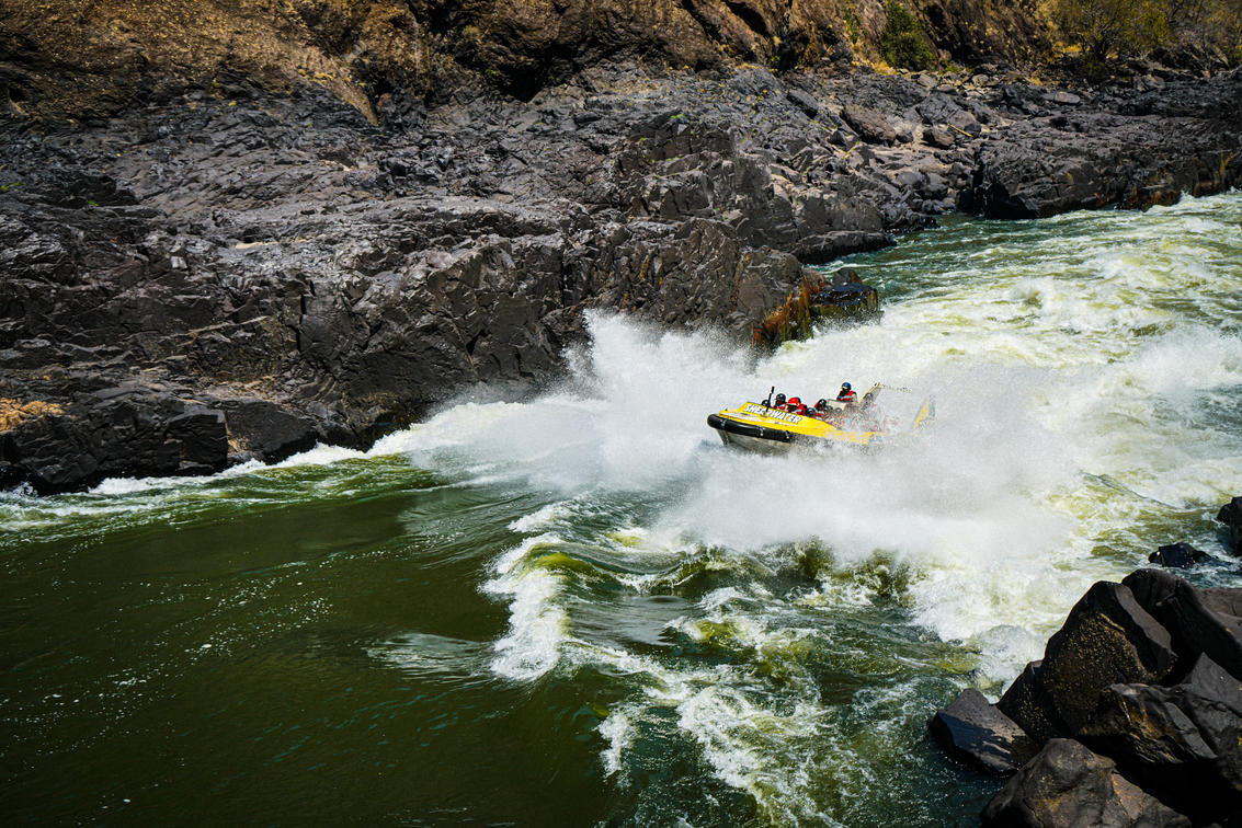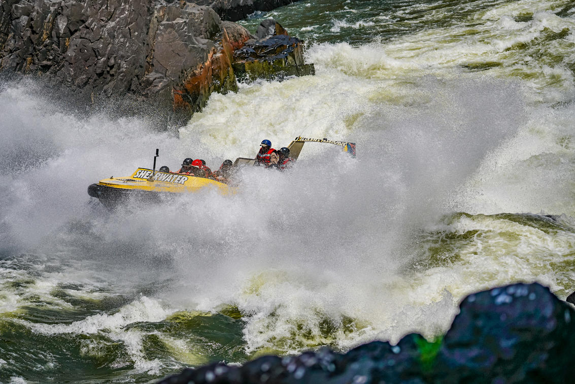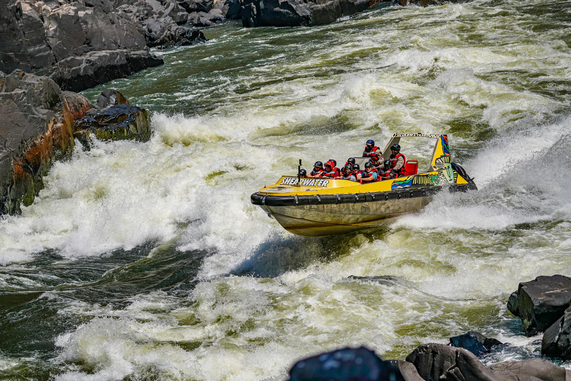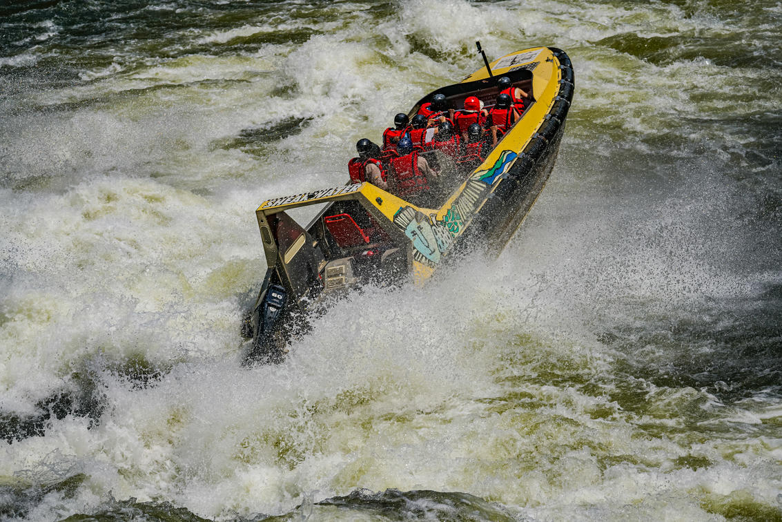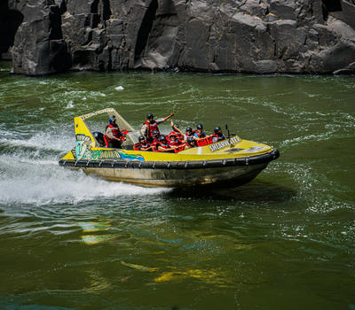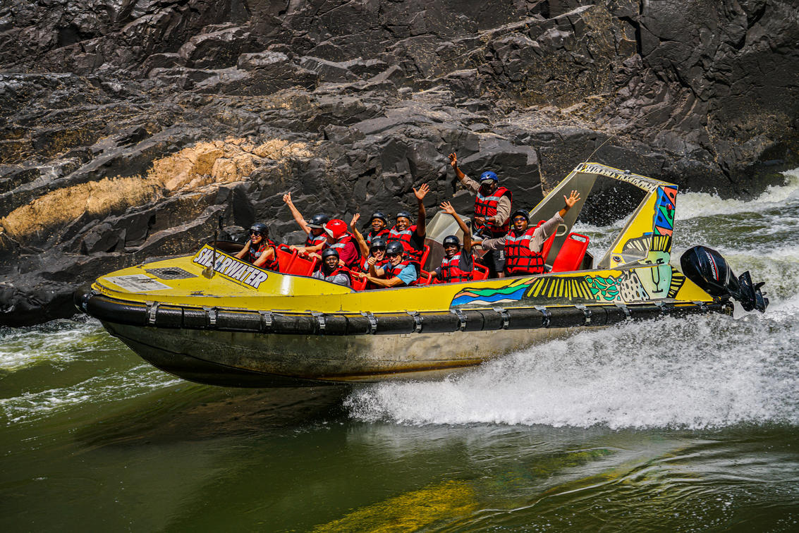 Experience the thrill of navigating the Zambezi River's rapids and encountering Victoria Falls up close on our Adventure Jetboat.