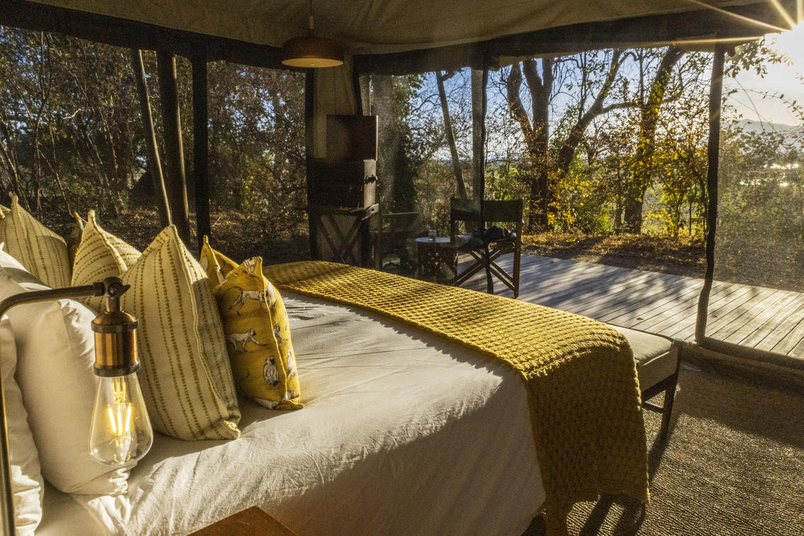 A tranquil moment in a Mana Sands Main Camp suite, where the bed faces out towards the trees beyond. Neutral tones and soft textures reflect the surrounding wilderness, while the open design invites the outdoors in — a perfect harmony of comfort and immersion in nature.