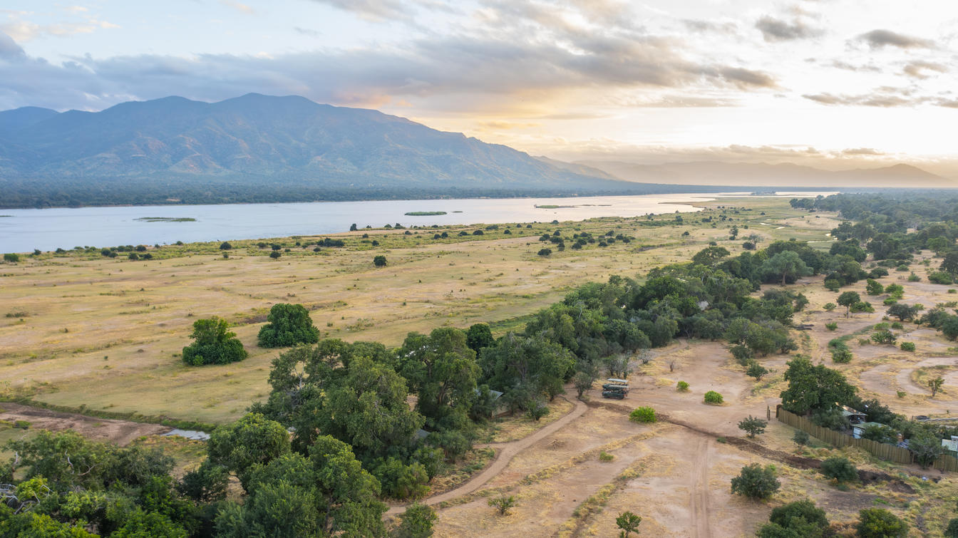 A golden-hour aerial view of Little Mana Sands, nestled discreetly beneath the tree line with sweeping views of the Zambezi River and escarpment. The camp’s rustic charm blends seamlessly into the floodplain, offering guests an intimate and immersive safari setting.