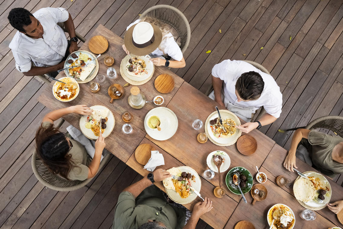A bird’s-eye view of a shared lunch at Little Mana Sands. While not every meal is hosted this way, some are served family-style with your group, creating space for connection, conversation, and relaxed enjoyment in the heart of the bush.