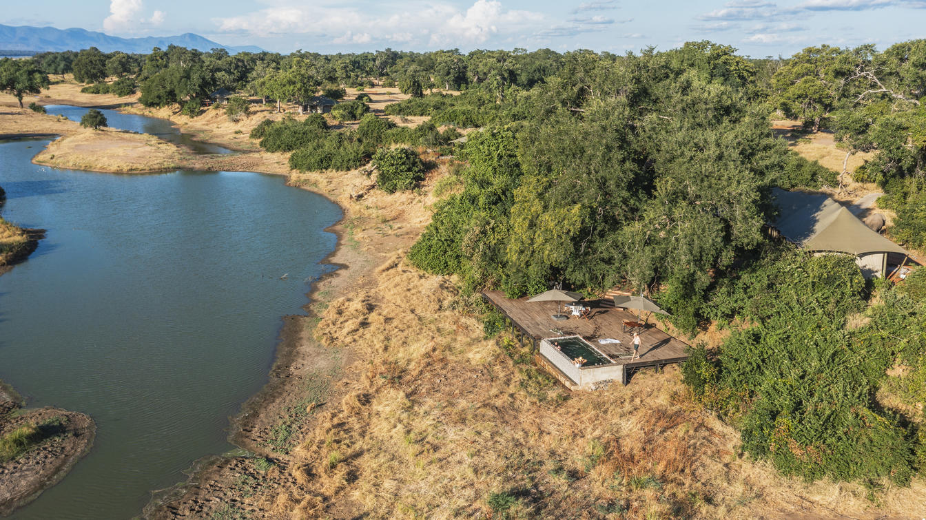 An aerial view of Mana Sands Main Camp’s pool deck, overlooking a seasonal pan directly in front of the eastern tents and main area. With shaded loungers and a private plunge pool, it’s an ideal space to cool off, unwind, and watch for wildlife drawn to the water.
