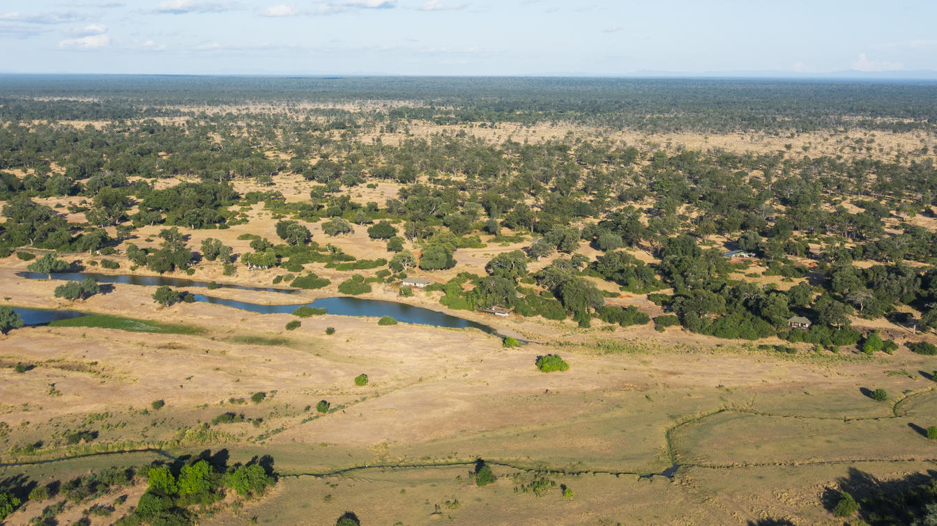 A wide aerial of Mana Sands Main Camp, nestled in its private concession on the edge of a seasonal pan. The layout offers space, seclusion, and sweeping views of the floodplain — a rare sense of privacy on the remote Western boundary of Mana Pools.