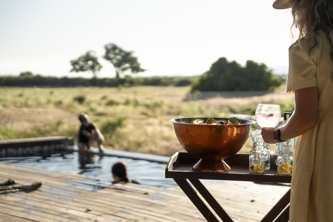 Sundrenched and slow — a chilled G&T waits on the pool deck at Mana Sands Main Camp as guests enjoy a midday dip. With views over the seasonal pan and bush beyond, this is barefoot luxury at its most refreshing.