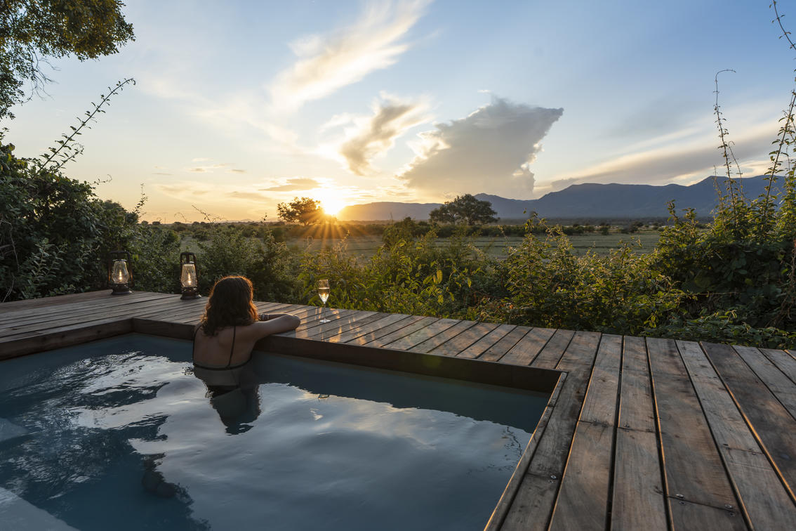 A guest enjoys a quiet moment in a private plunge pool at Mana Sands Main Camp, with uninterrupted views across the floodplain toward the Zambezi escarpment. Perfect for sunset soaks or midday cool-downs, this pool promises stillness, space, and soul-soothing luxury.