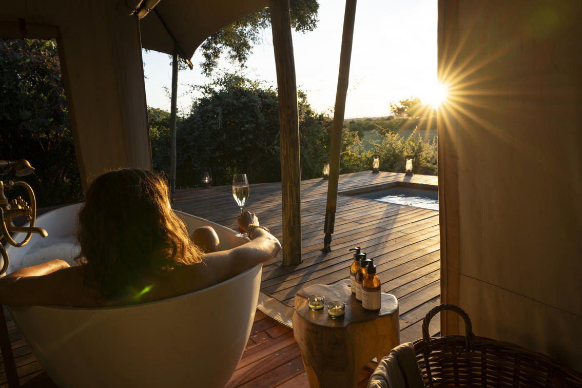A guest unwinds in her bath at sunset, glass of wine in hand and plunge pool just steps away. At Mana Sands Main Camp, even a simple soak becomes a golden-hour ritual — surrounded by birdsong, wild air, and the quiet luxury of nature.