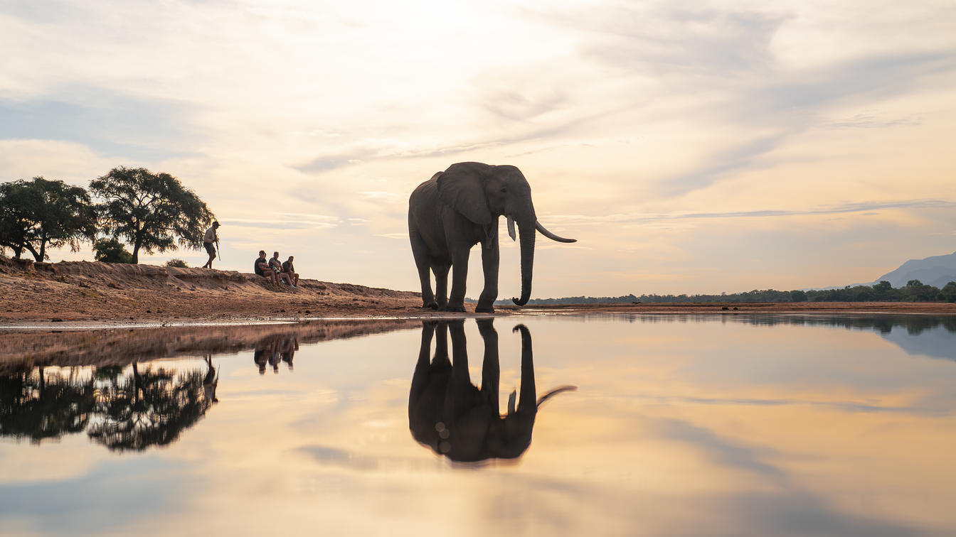 There are moments in Mana Pools that defy words — when the sky turns to silk, the water lies still, and a tusker appears as if conjured from the landscape. This wasn’t planned or posed. Just a quiet evening near one of the pans in front of camp, a few guests stretching their legs… and a gentle giant who wandered into view.