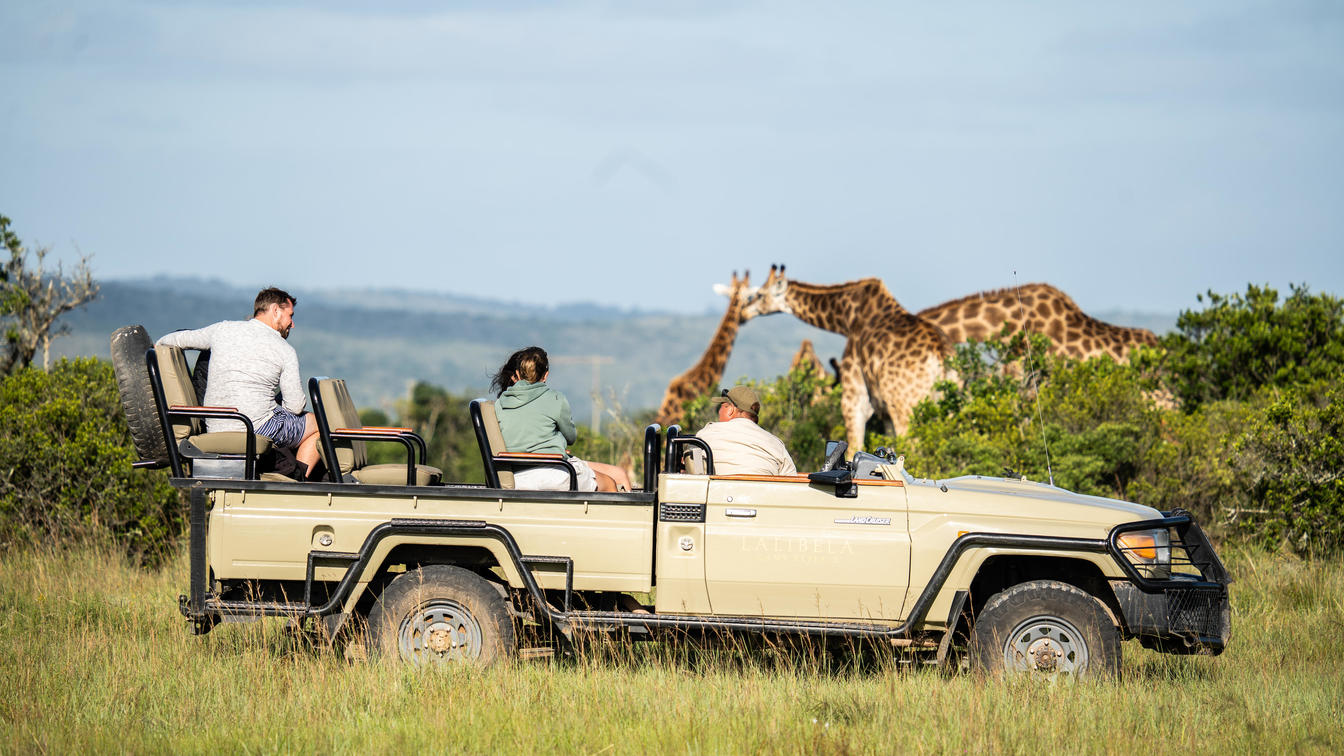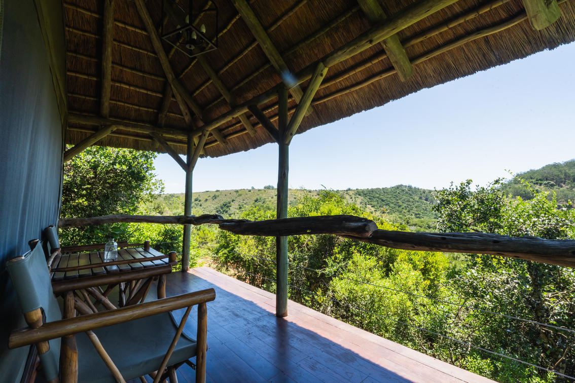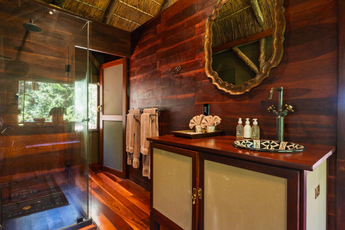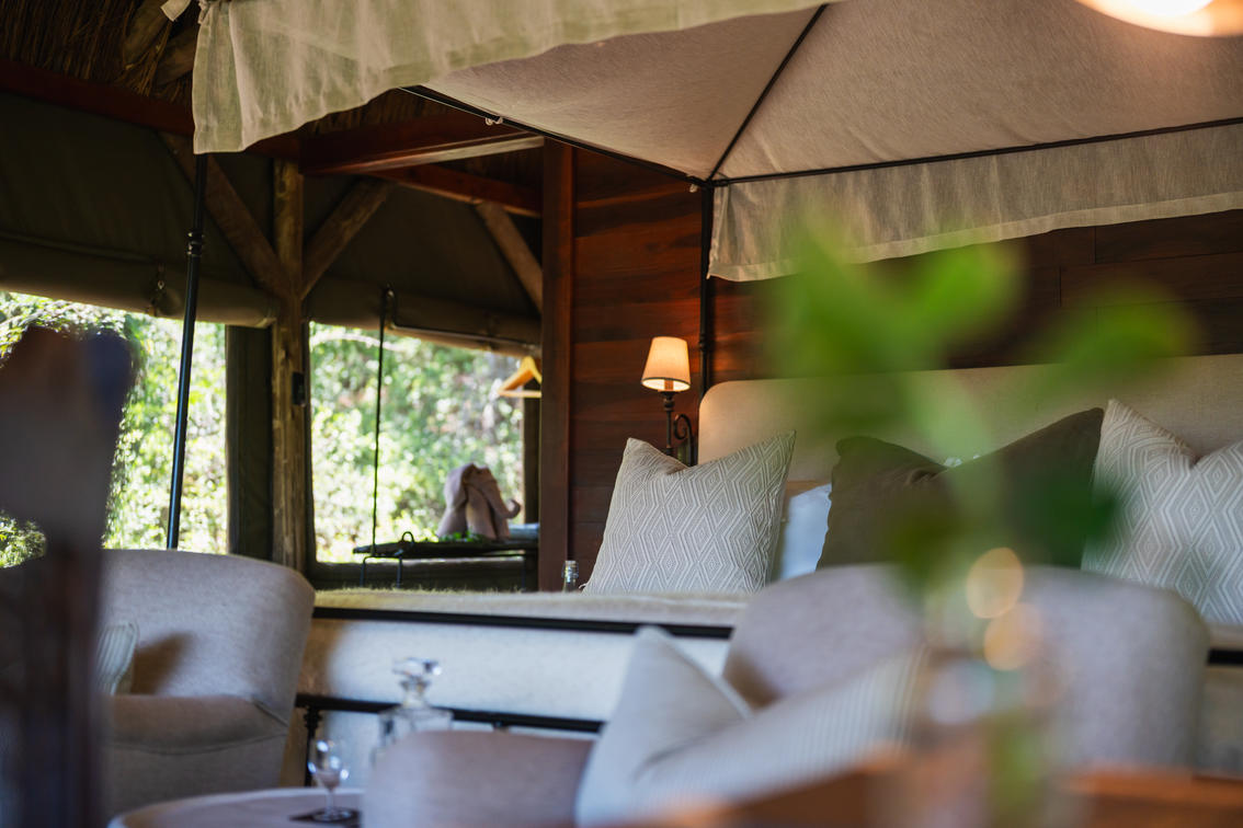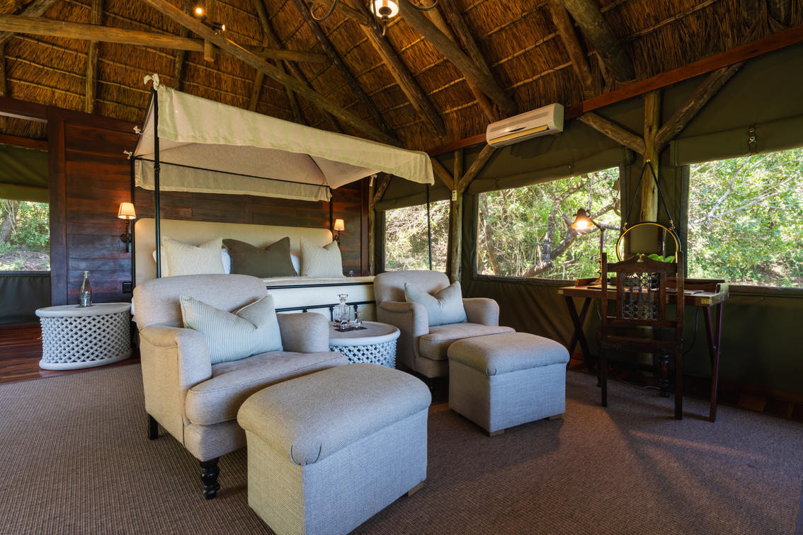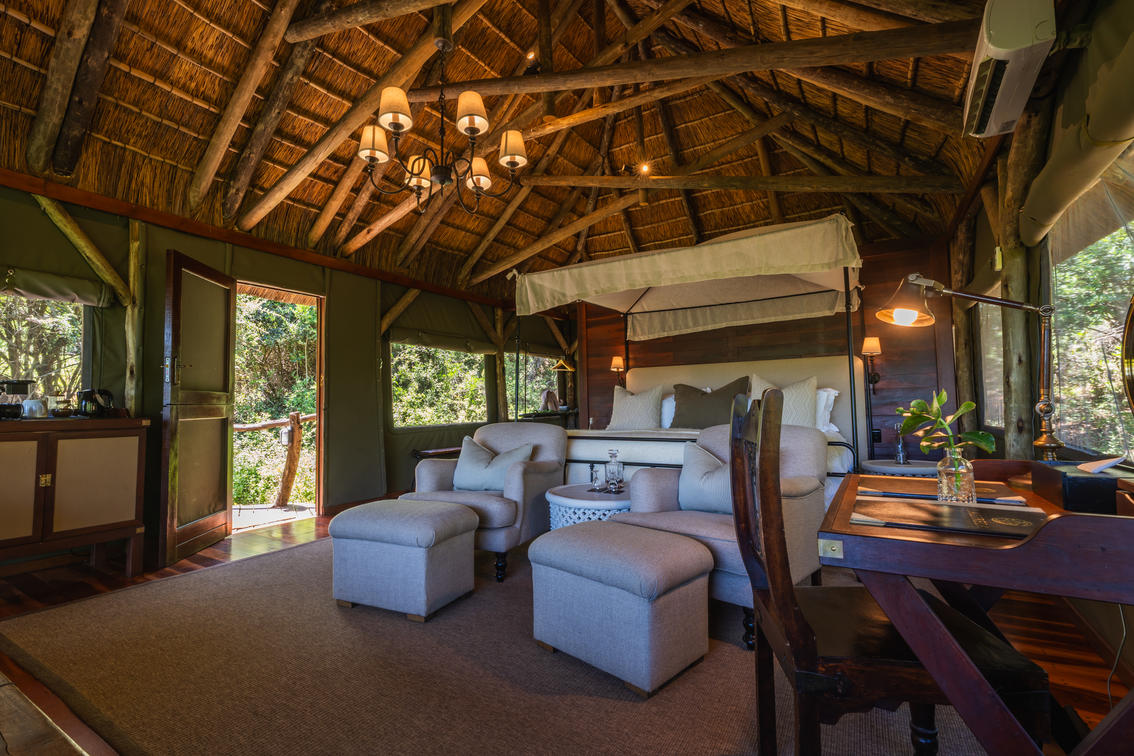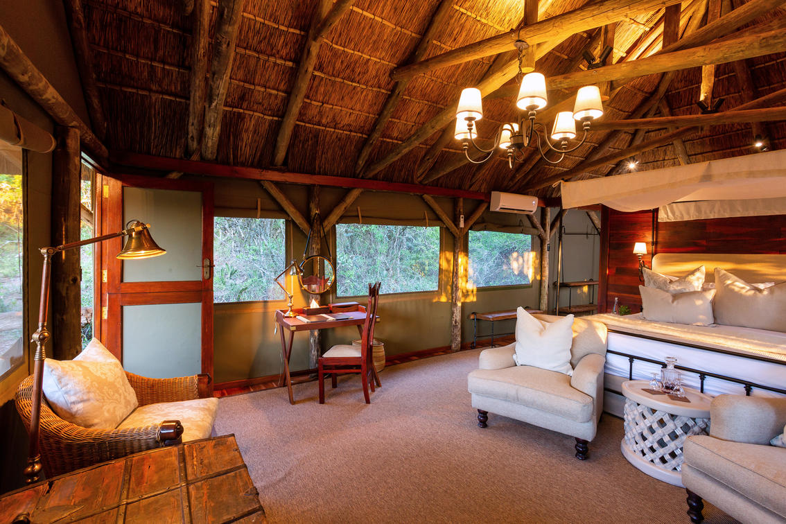 The en-suite rooms, with their canvas walls and thatched roofs, have huge window areas and give guests the feeling of being right in the bush.