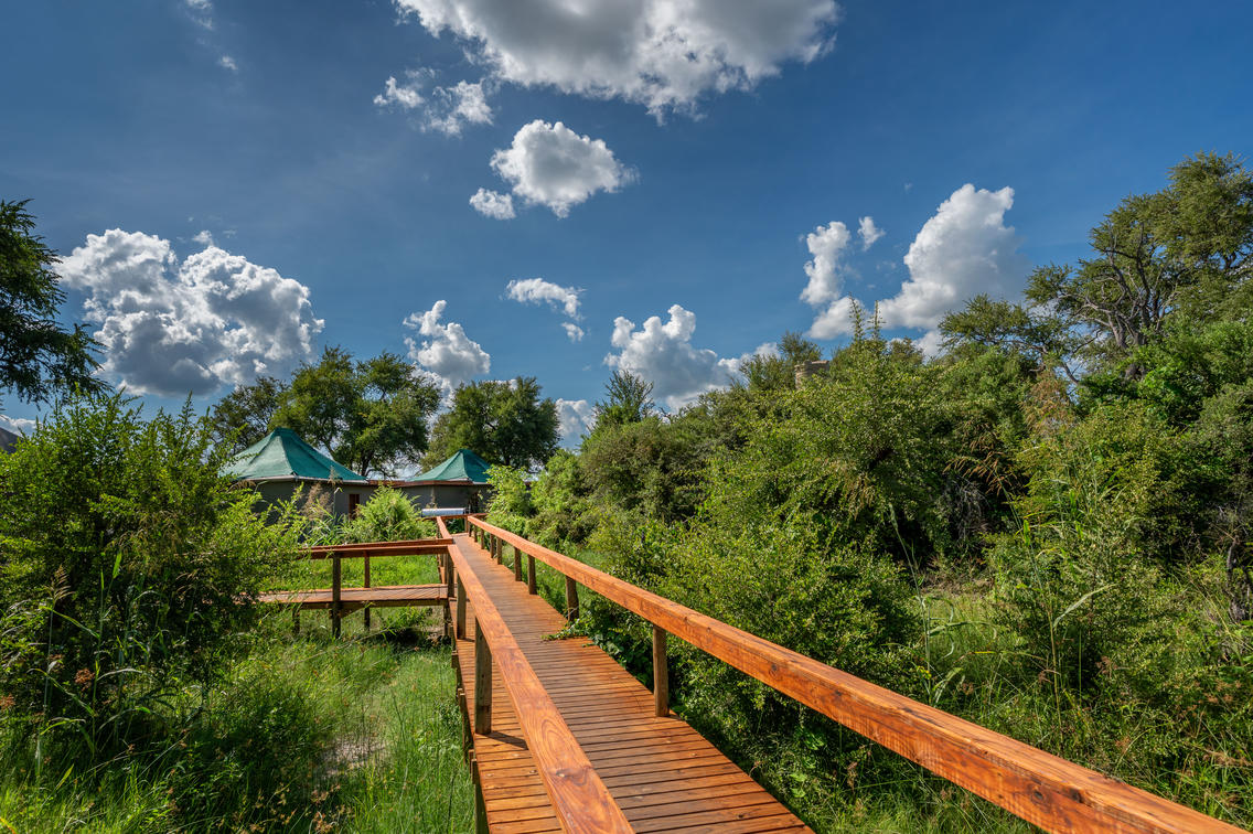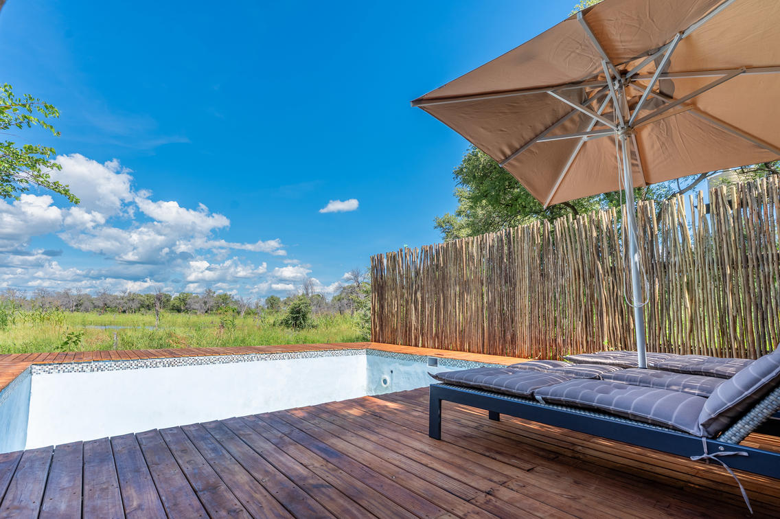The guest area at Gomoti Villas is beautifully crafted and nestled within a lush leadwood canopy, positioned on a prime island formed by one of the five main channels of the Okavango Delta—the Gomoti River, from which it takes its name. A unique feature of this setting is its panoramic view of two lagoons, offering an exceptional vantage point for wildlife viewing.